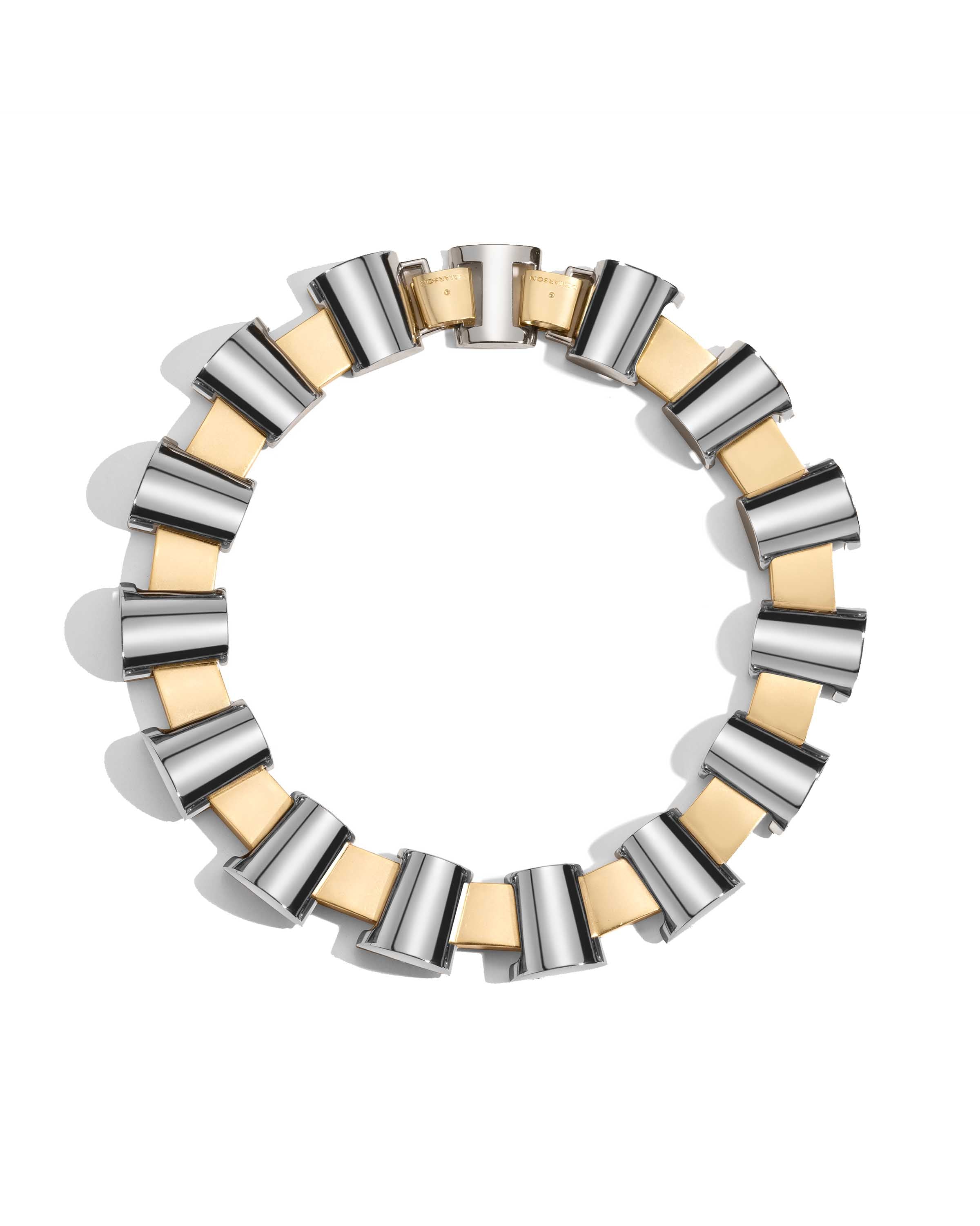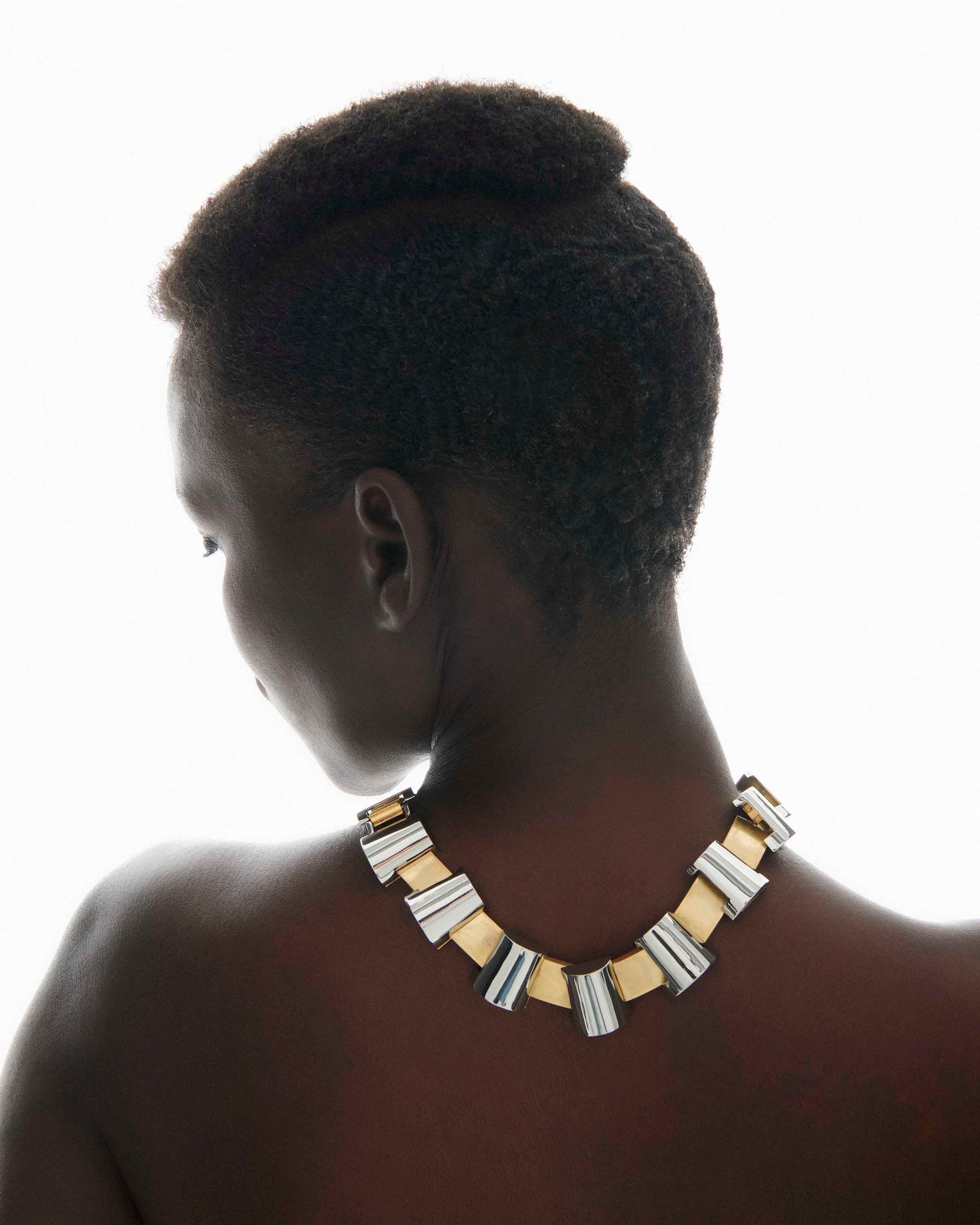You've never seen a necklace like this before. Dress it up or down, the Lou necklace is a showstopper regardless of how you style it. Sculptural and adjustable, this two tone graphic necklace is a timeless piece that elevates any outfit.