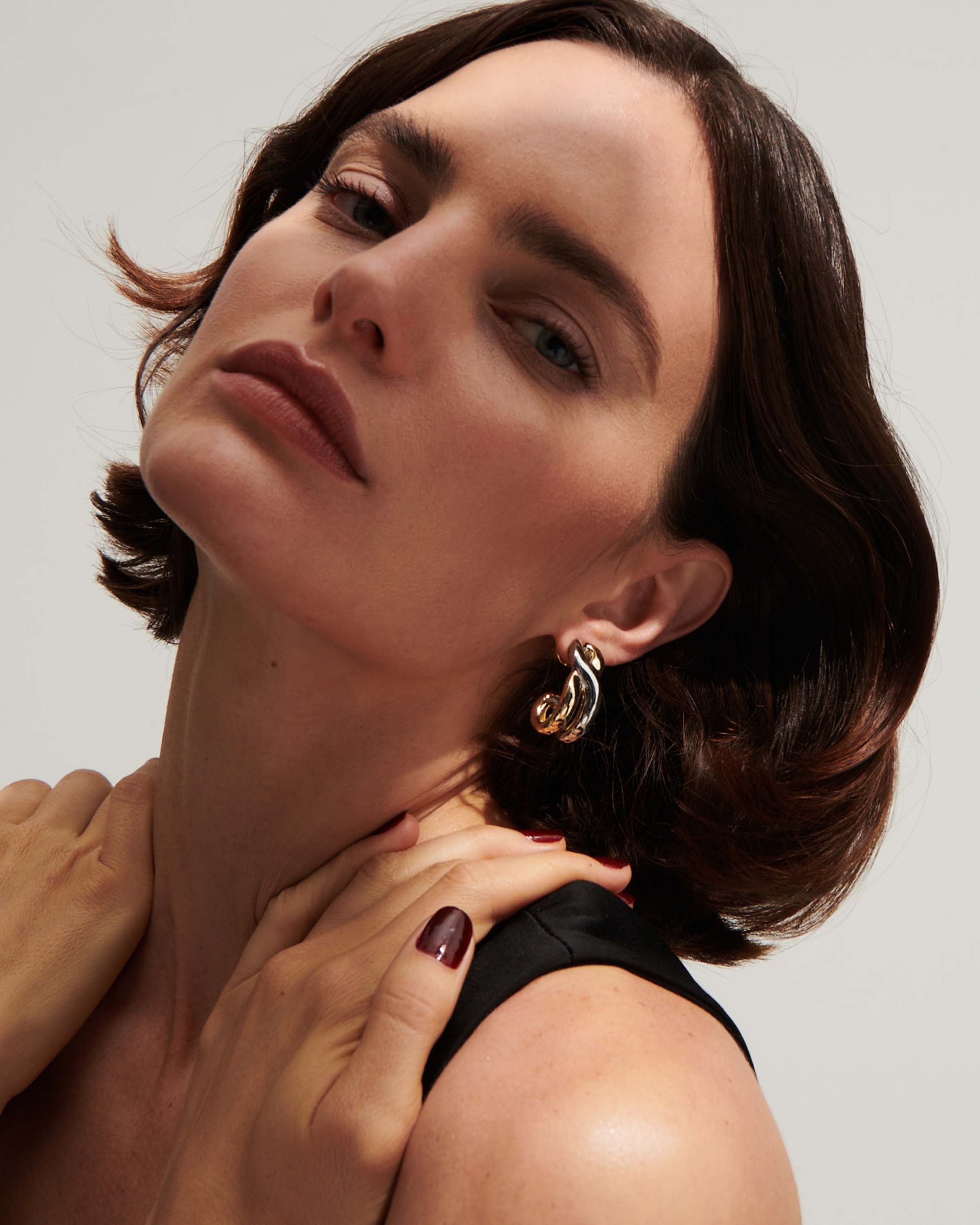 An elegant hoop with a twist inspired by the classic infinity shape. This two tone style mixes a timeless design with a modern two tone twist having one metal travel to the next seamlessly.