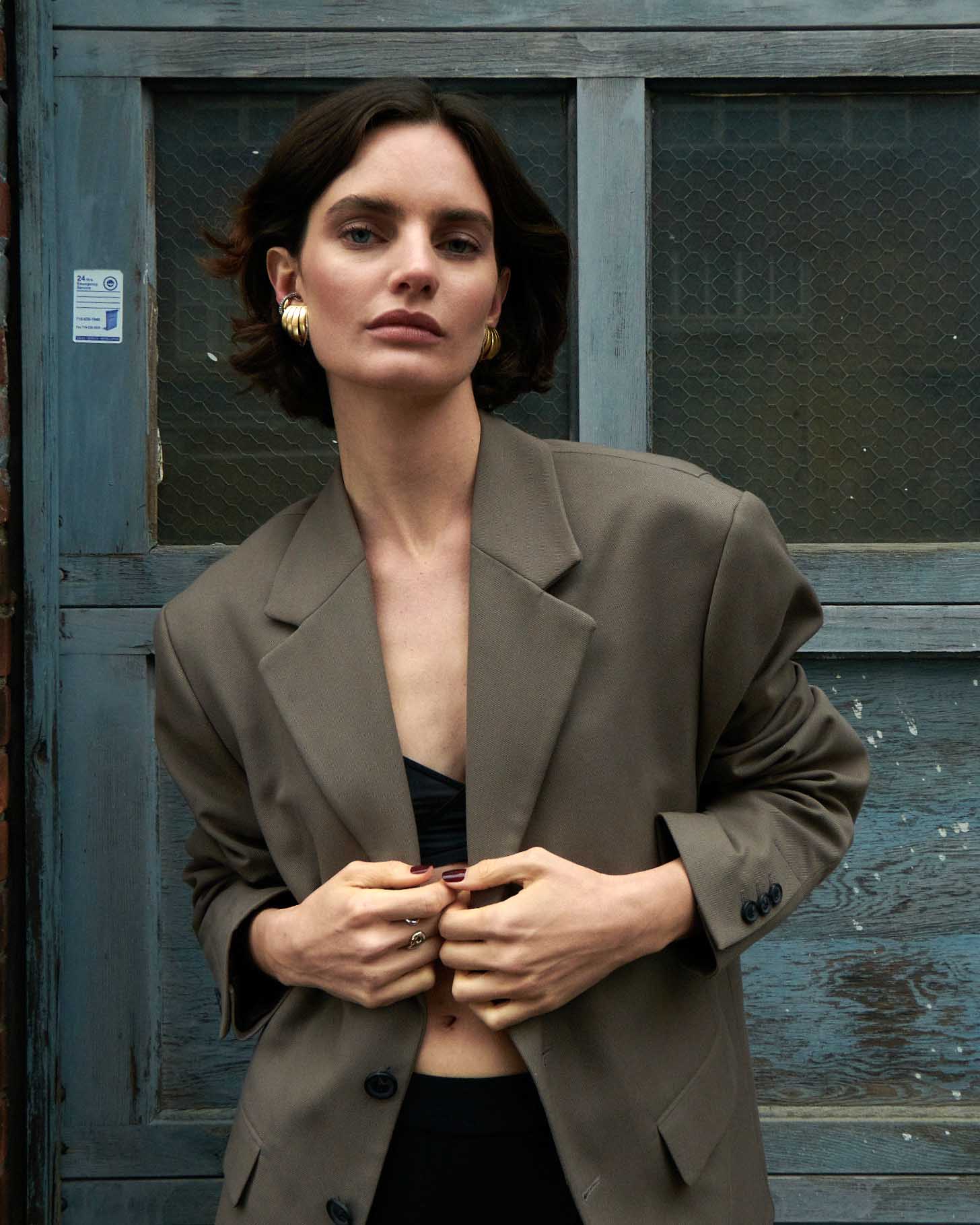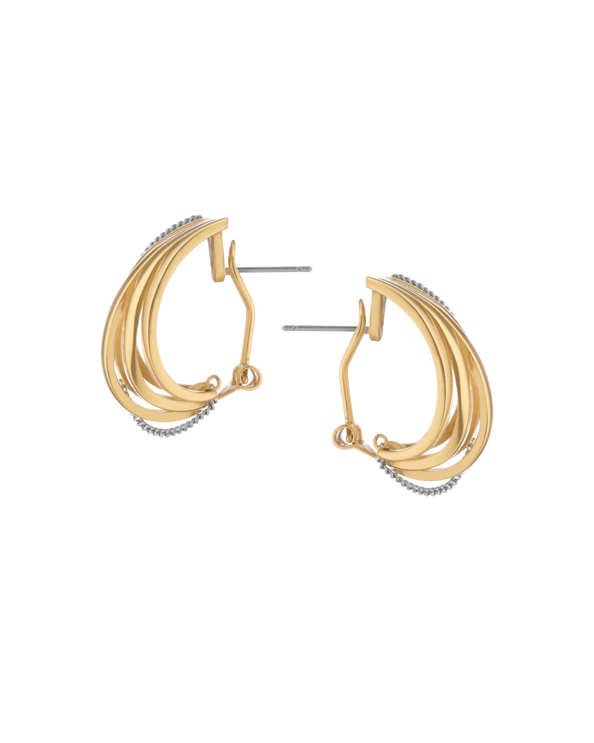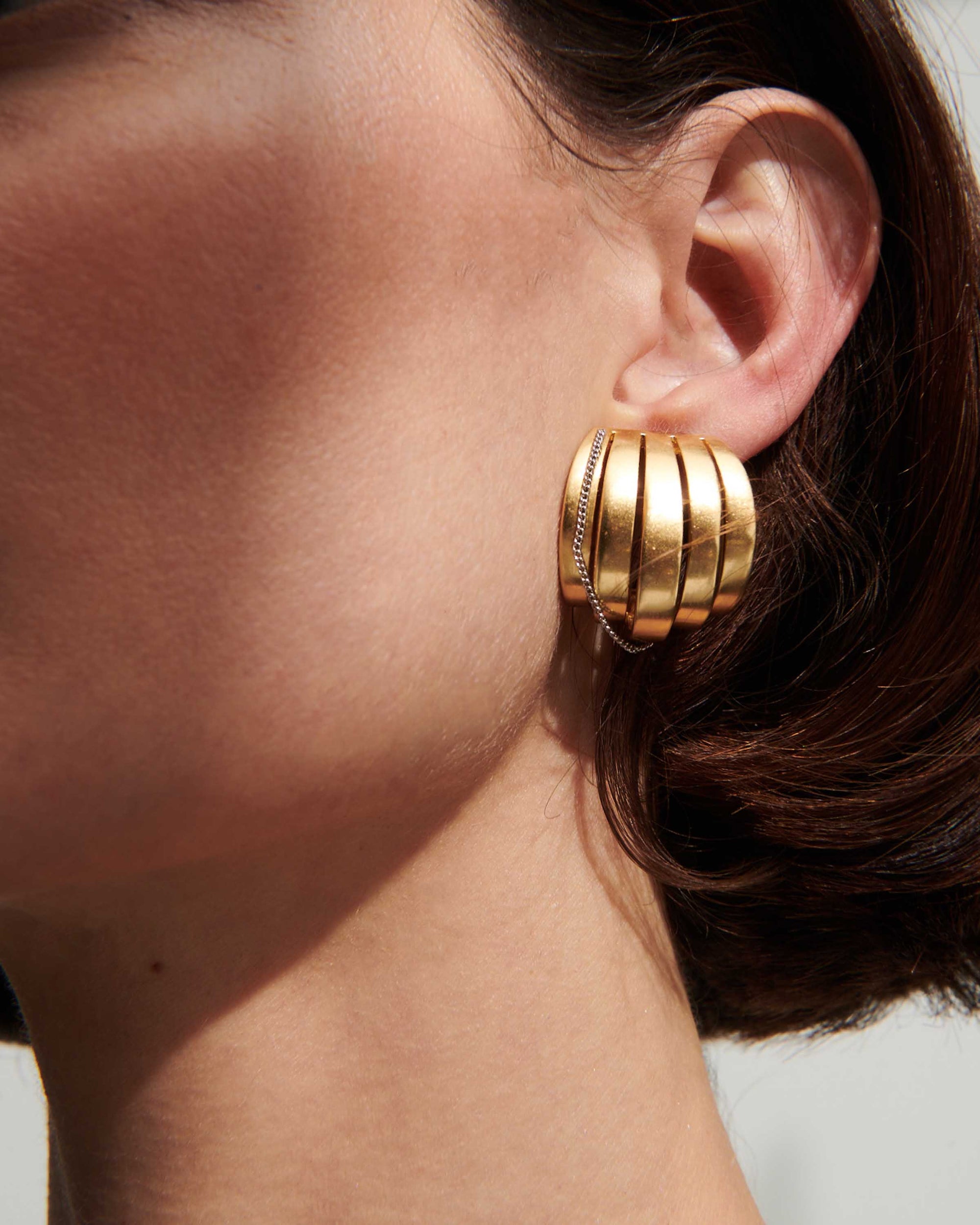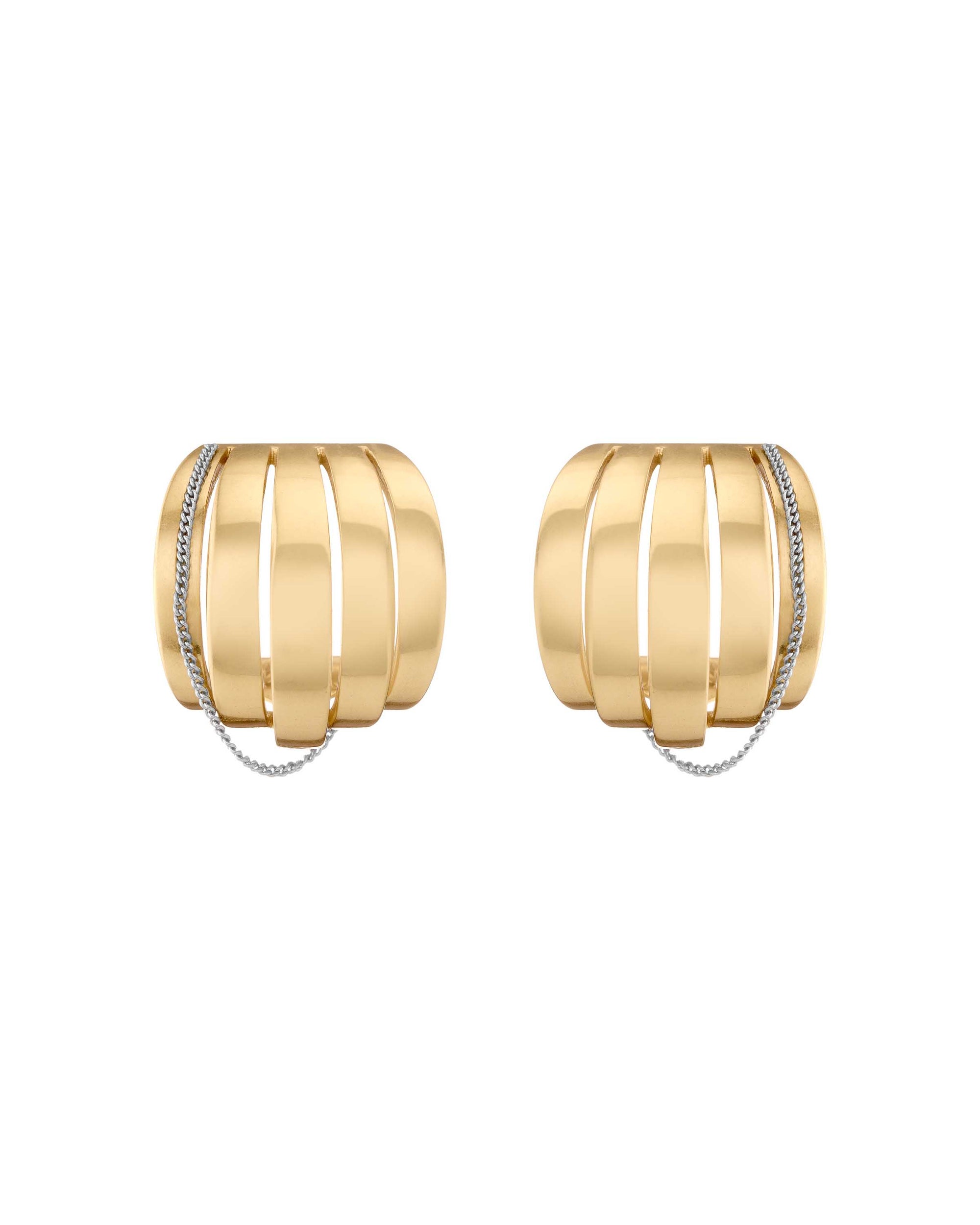 With a soft brushed gold effect and a thin silver hanging chain, this statement earring is inspired by the vintage statement earrings of the past.