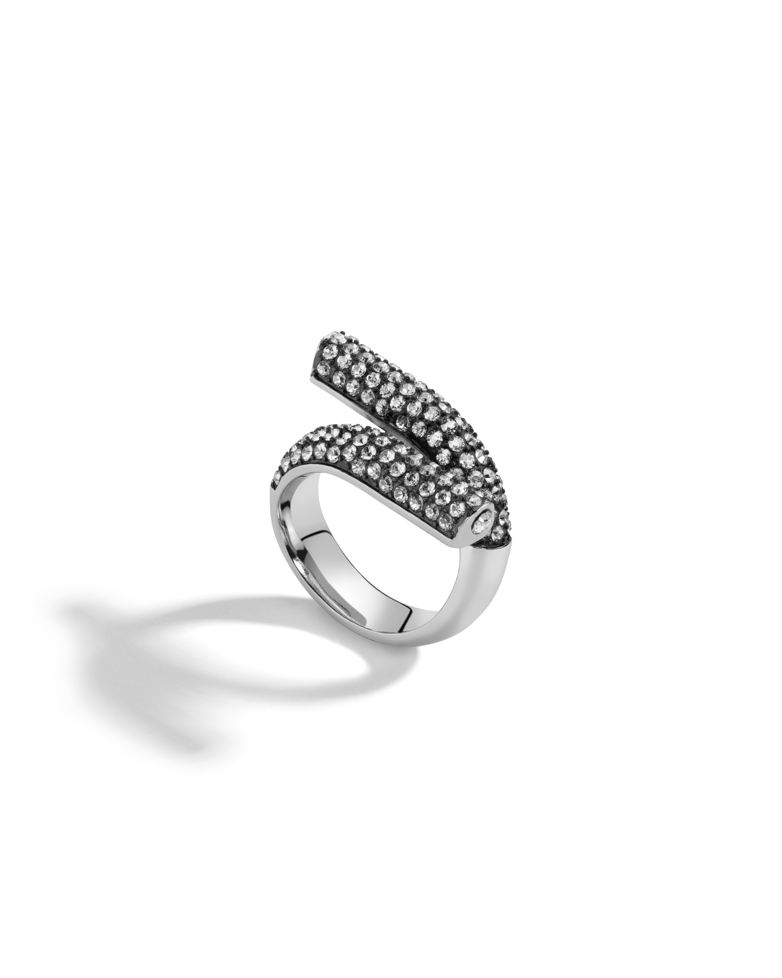 This ring is sure to draw a glance. Stand out from the crowd with this uniquely constructed parallel band ring with embedded clear radiant pavé crystal accents.