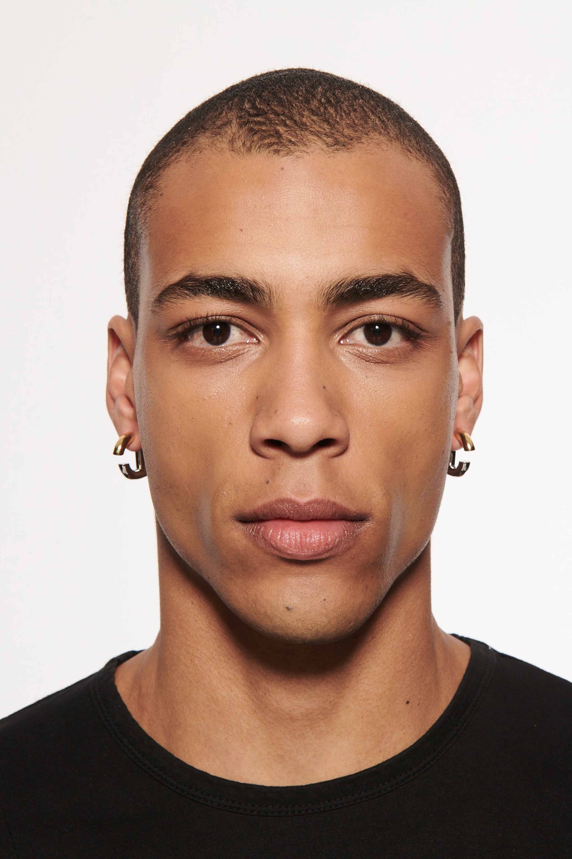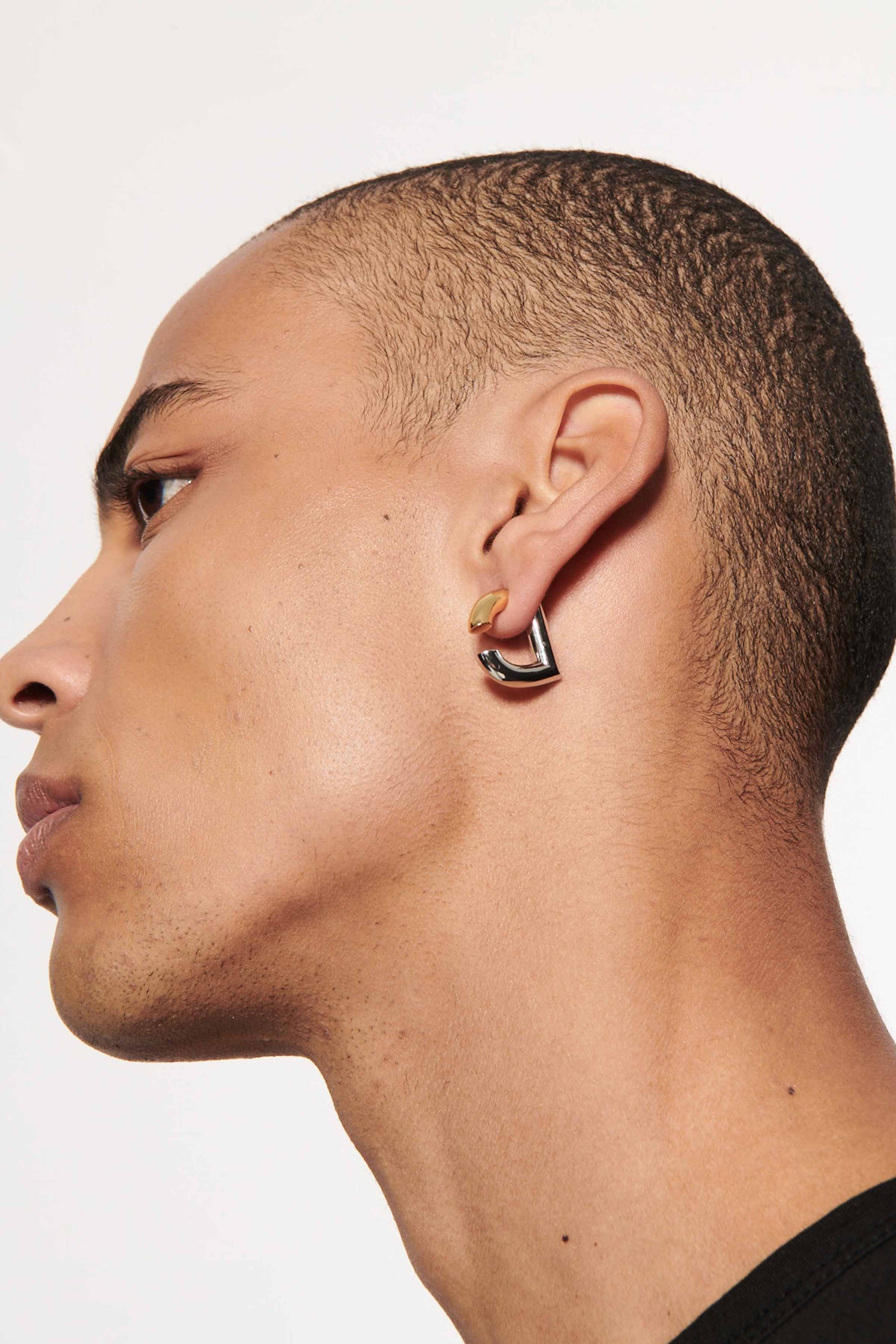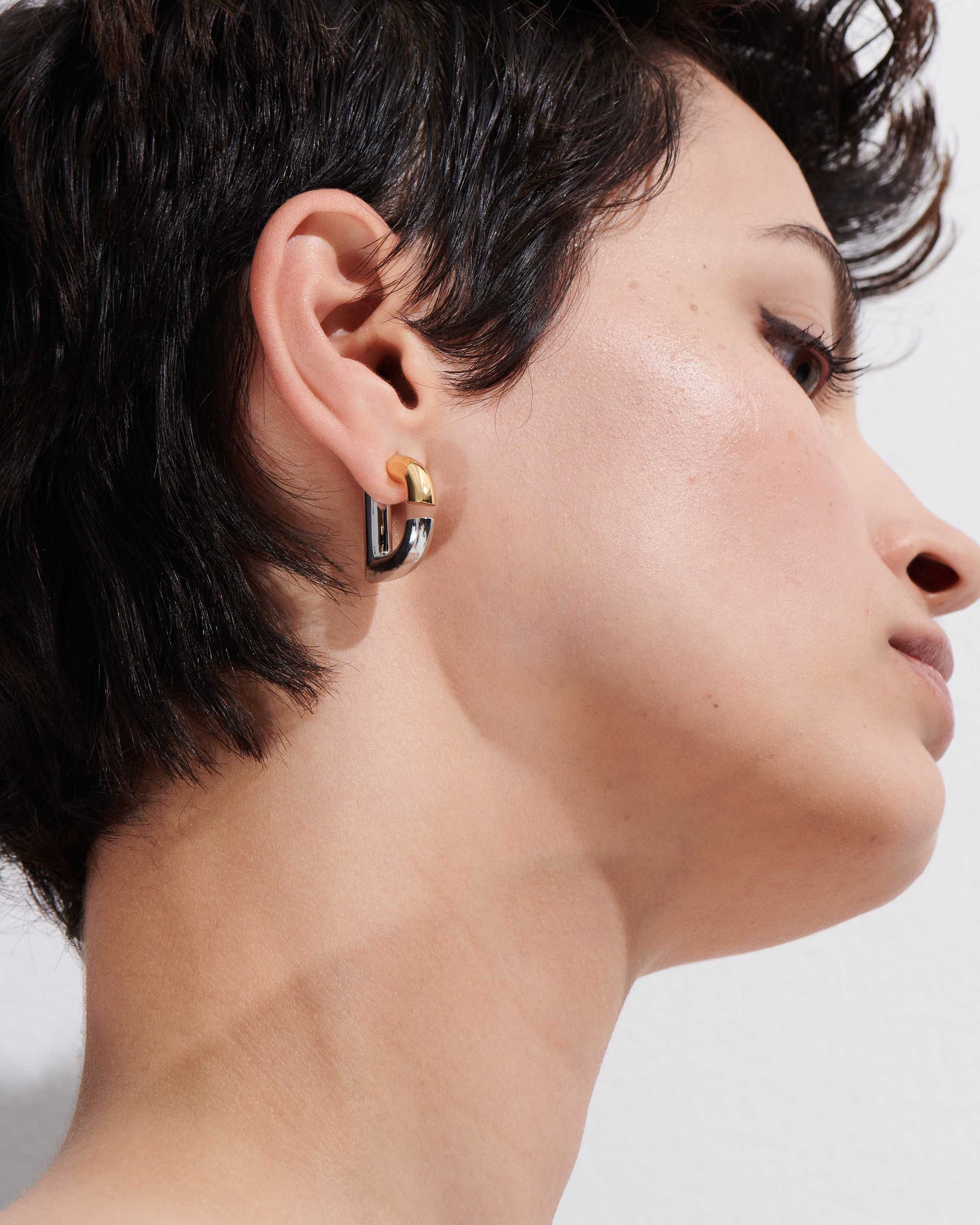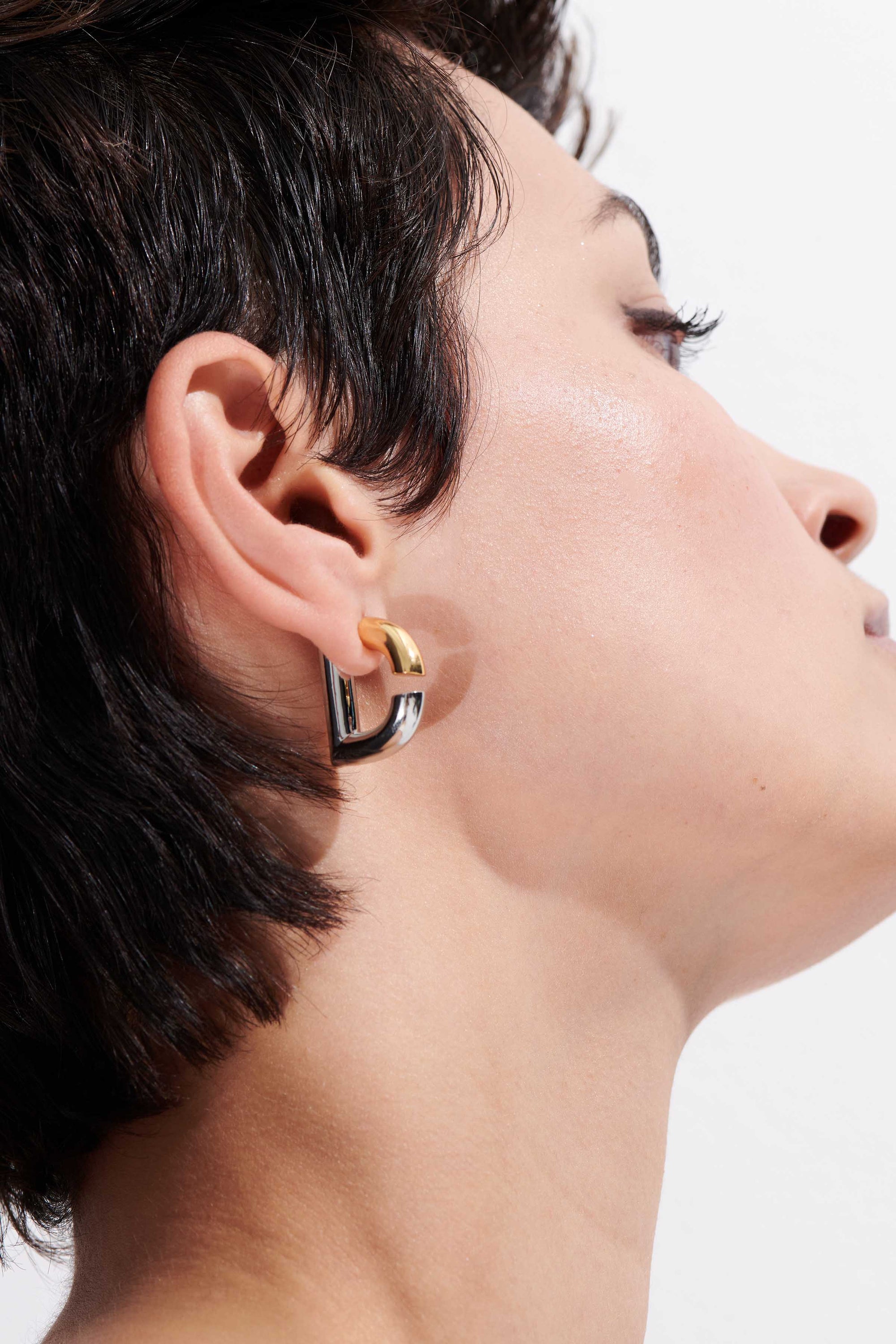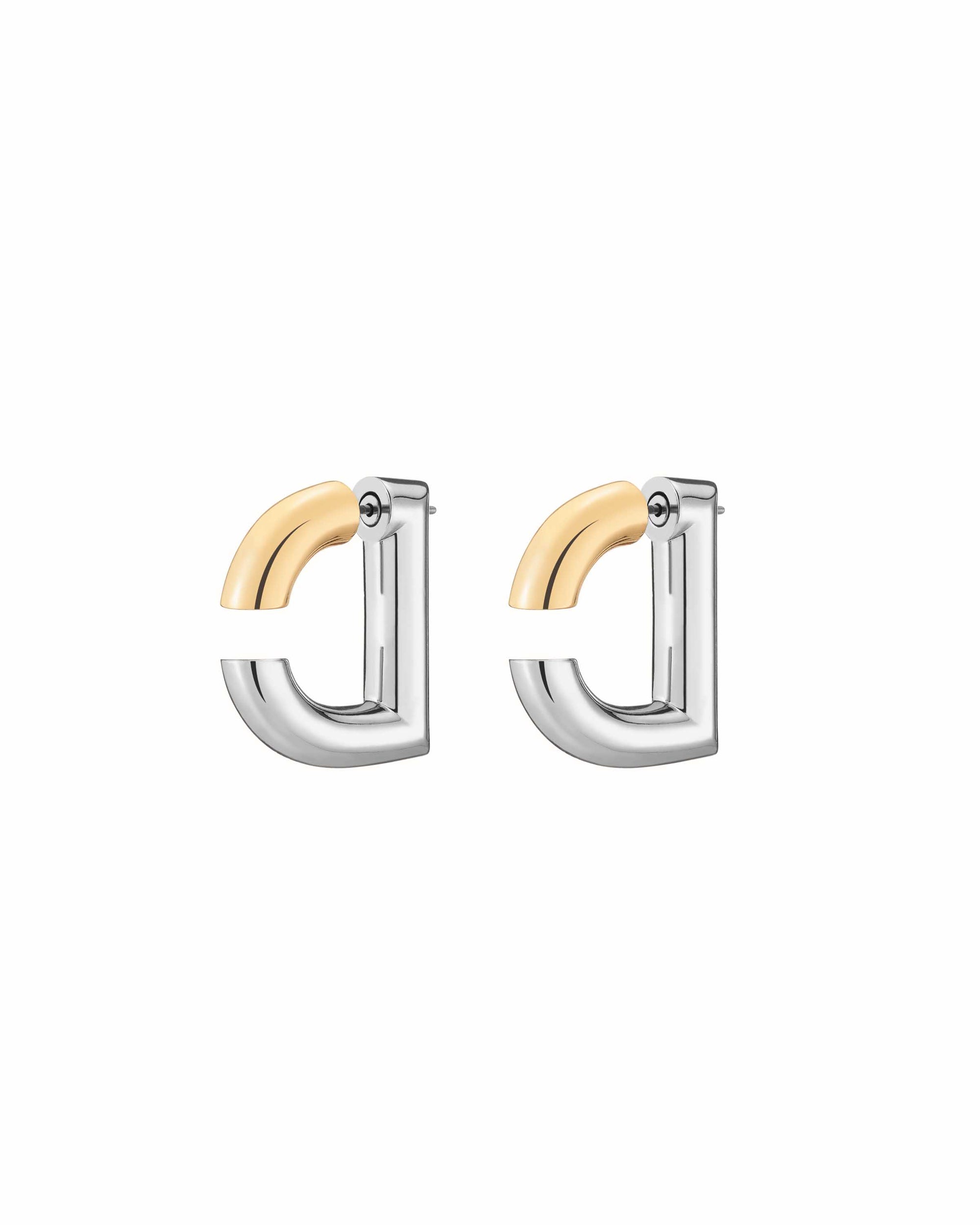 Two-tone 12k gold plated and silver rhodium plated brass earring set with a stylish, modern "D" design.