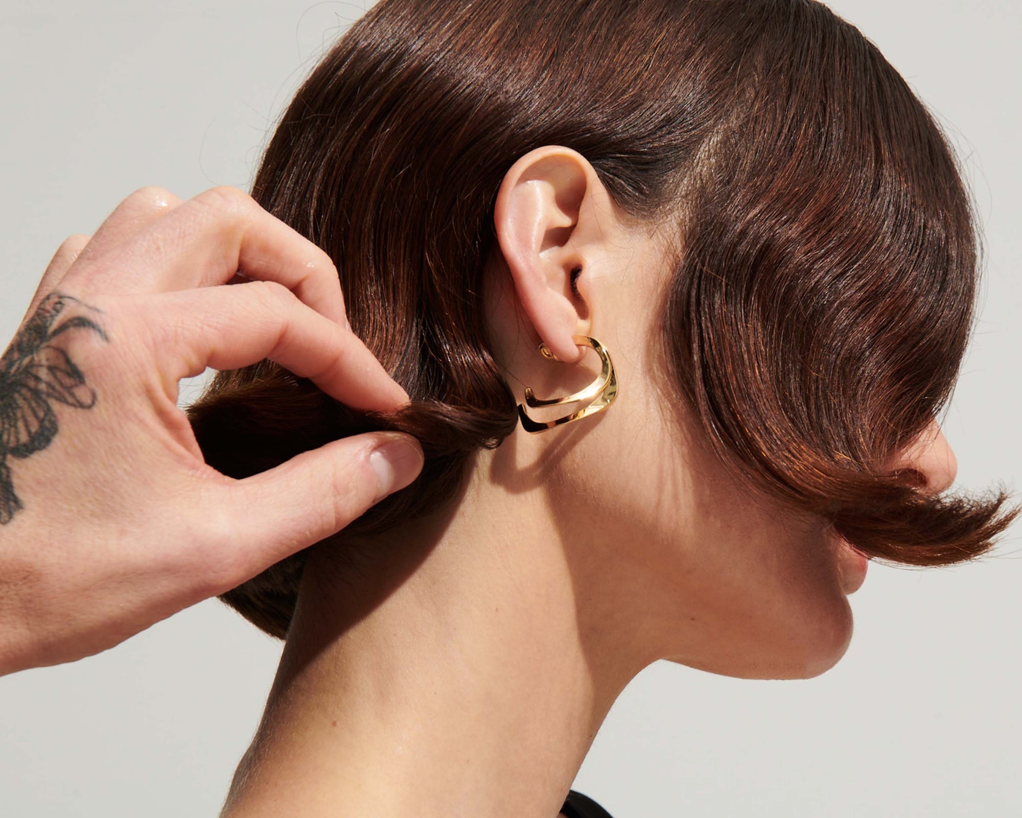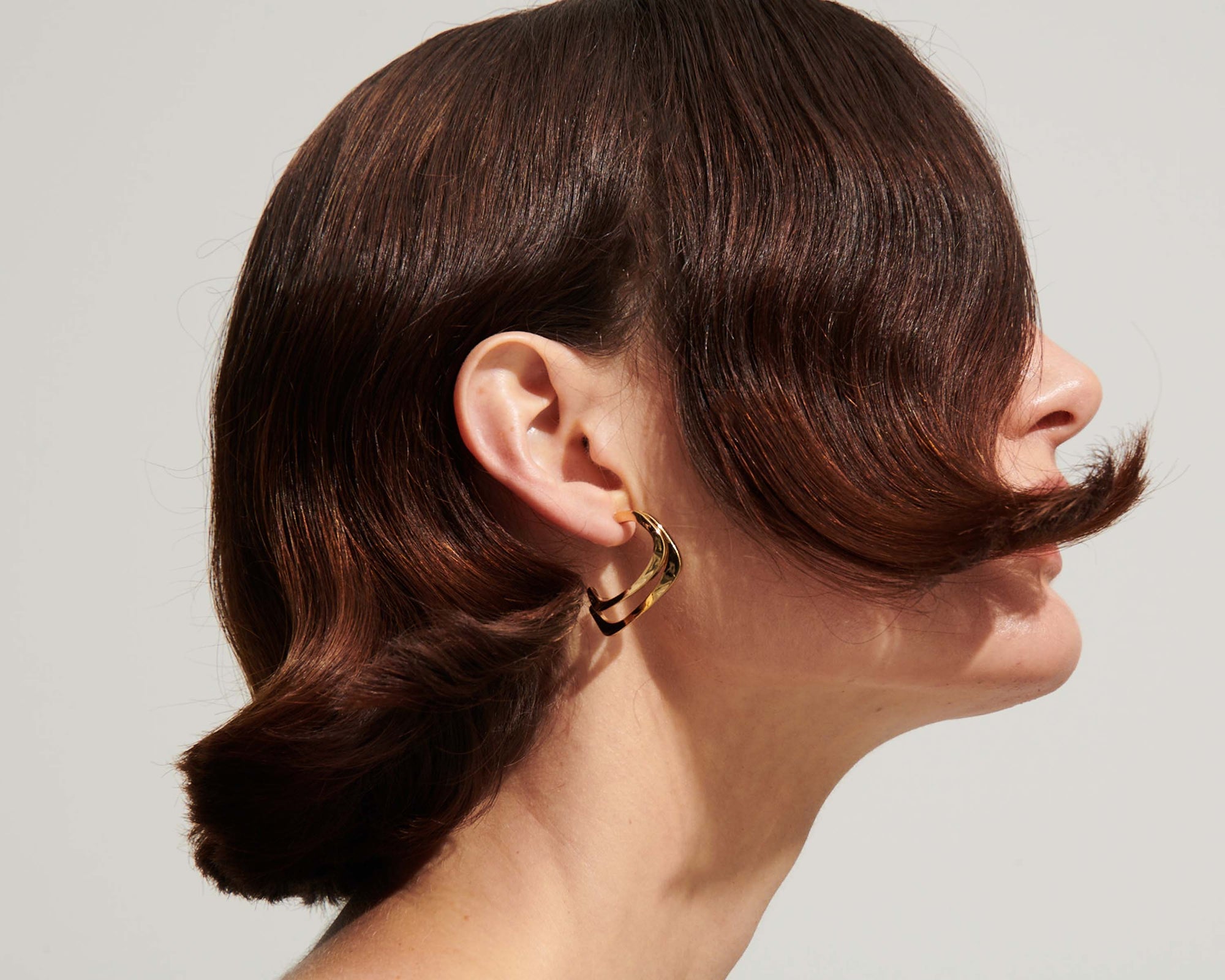 A classic hoop reinvented in an artistic shape. The Sandro features a twisted flat ribbon design with the illusion of wearing two stacked hoops.