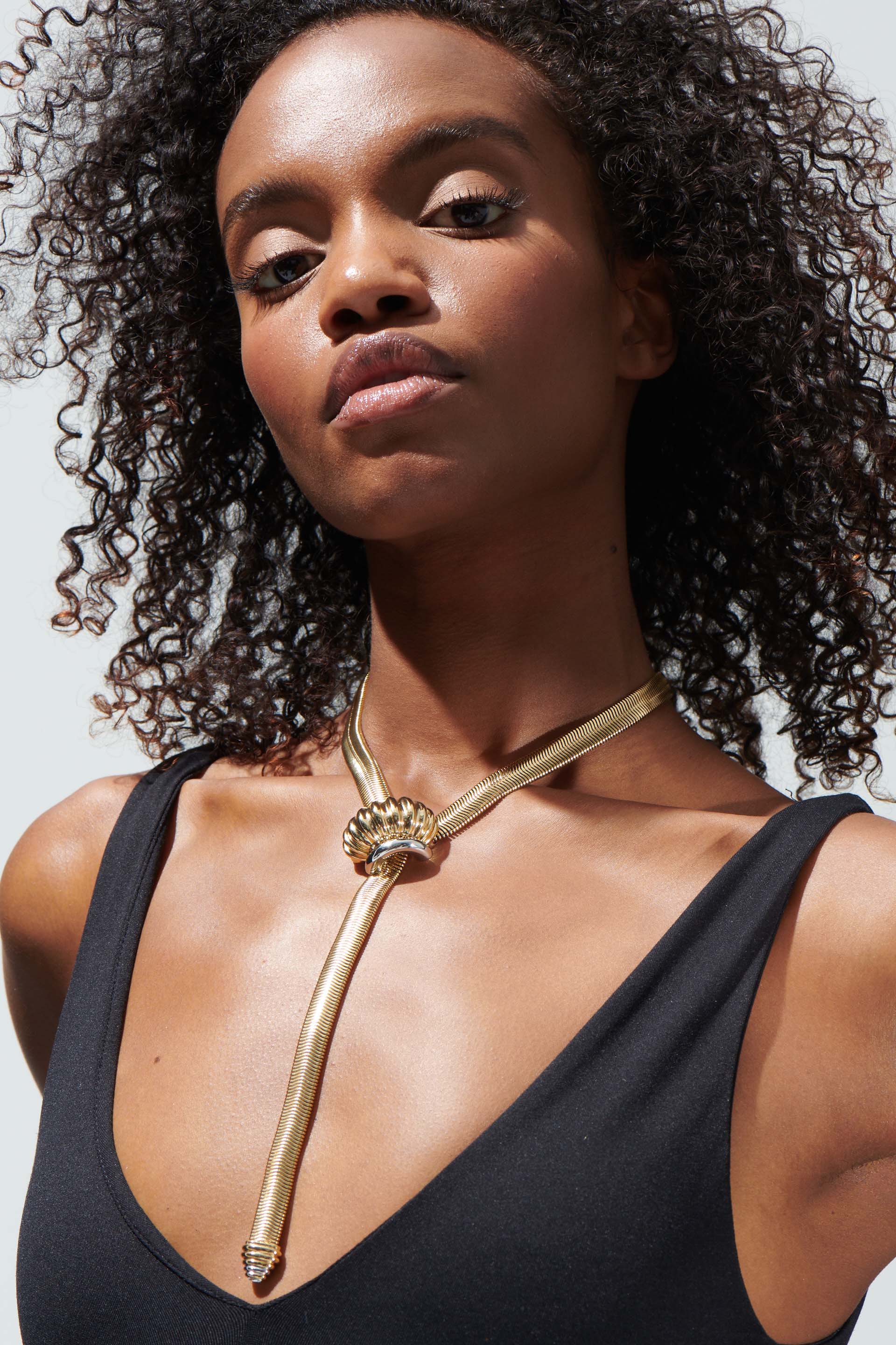 This unique necklace knows how to make statement. The soft snake chain is bold with the ribbed Lexi pendant which slides for a versatile look that is sizeless and eye catching.
