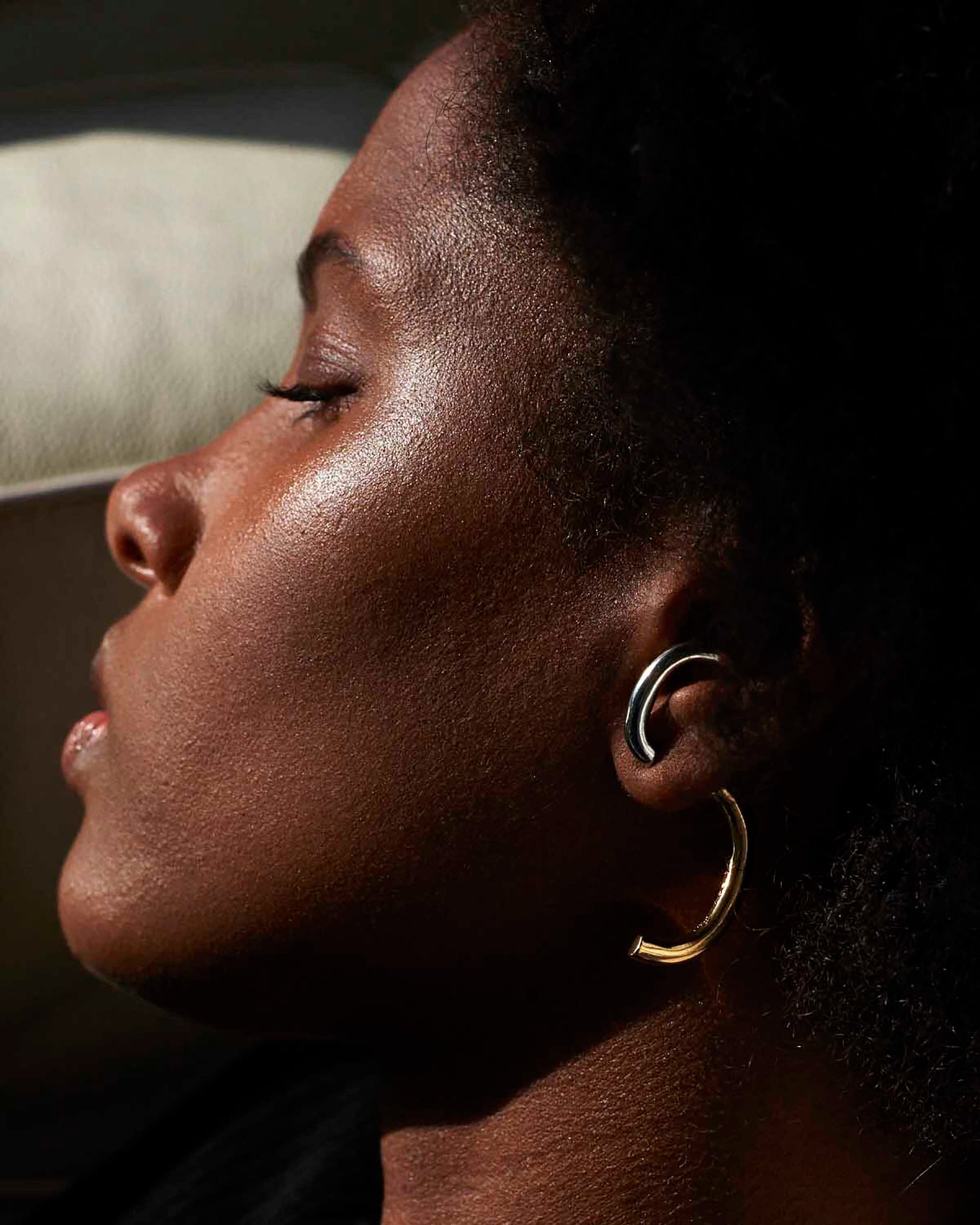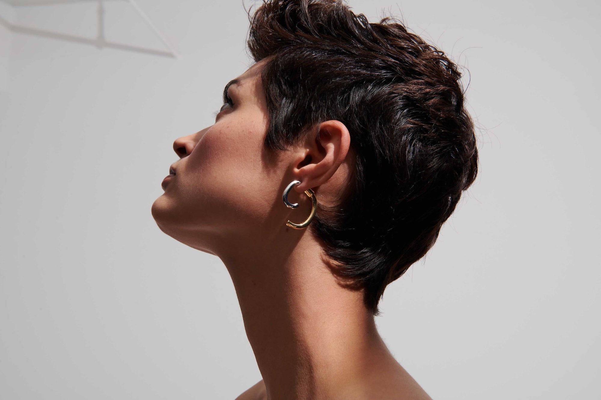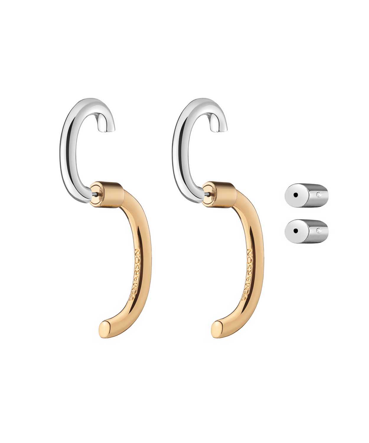 12k gold plated and silver rhodium plated earring set. This unique earring can be worn above the ear lobe or worn down for a dangle effect.