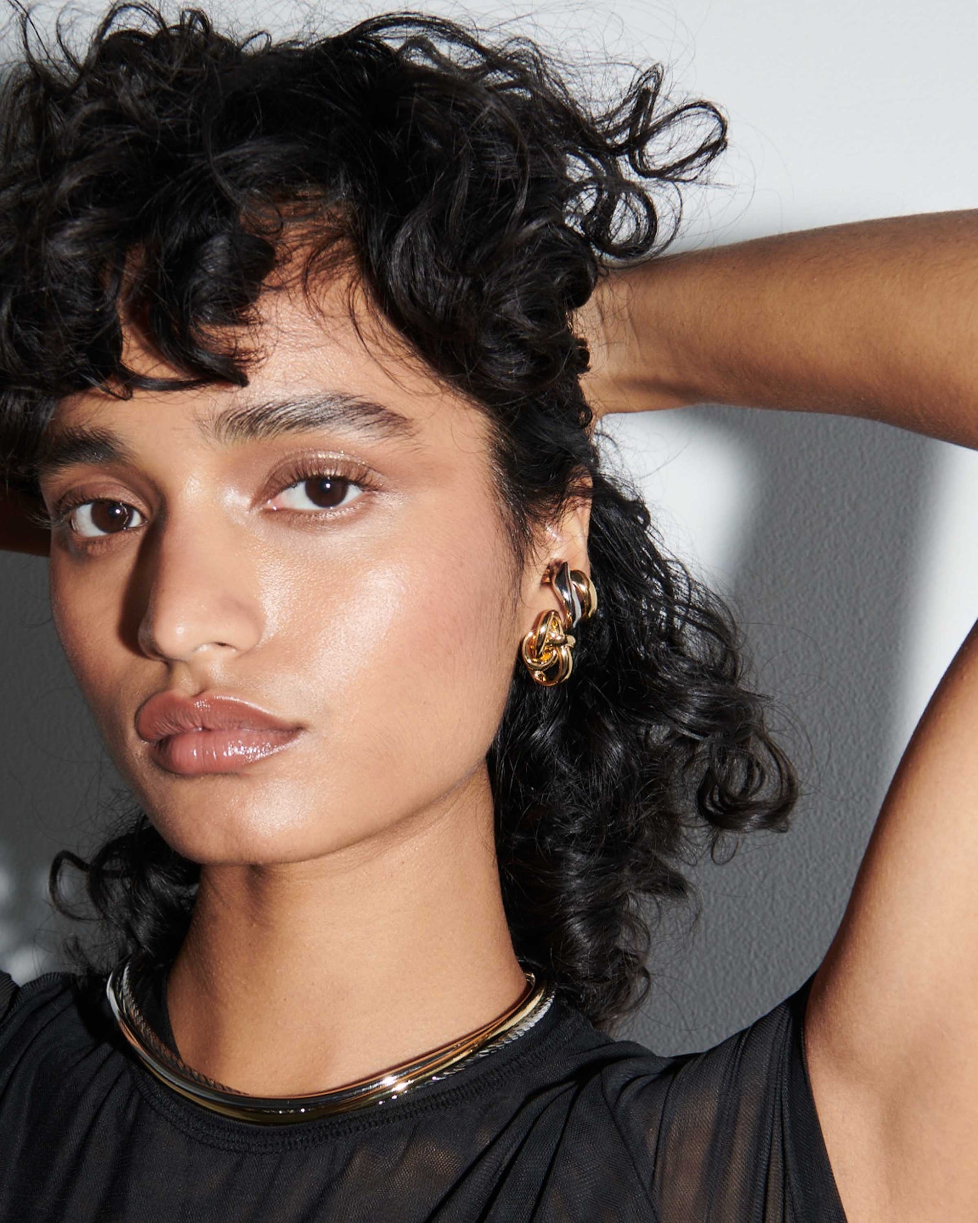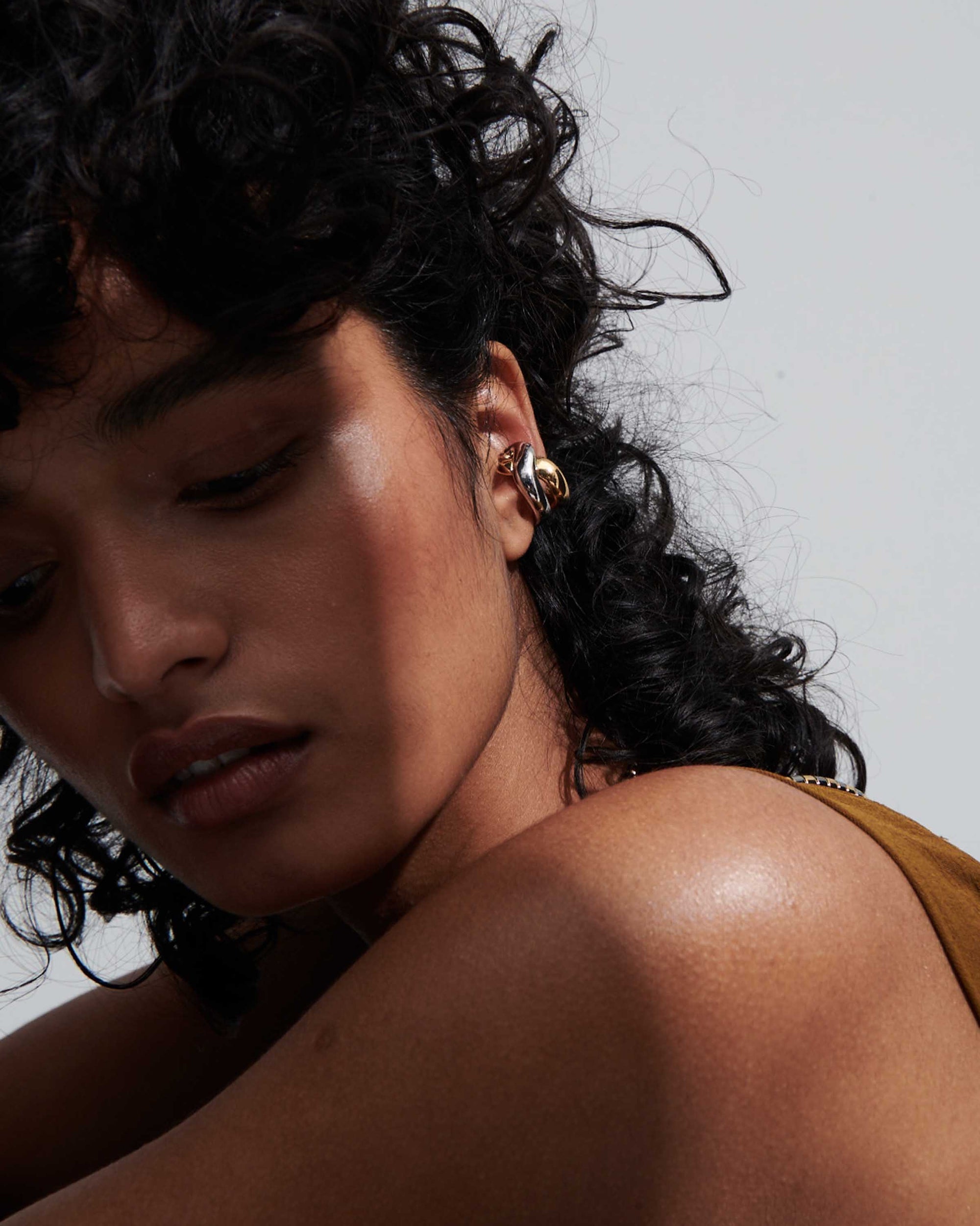 An elegant ear cuff with a twist. This two tone ear cuff mixes a classic finish with a modern piece. Featuring a hinge for easy wear.
