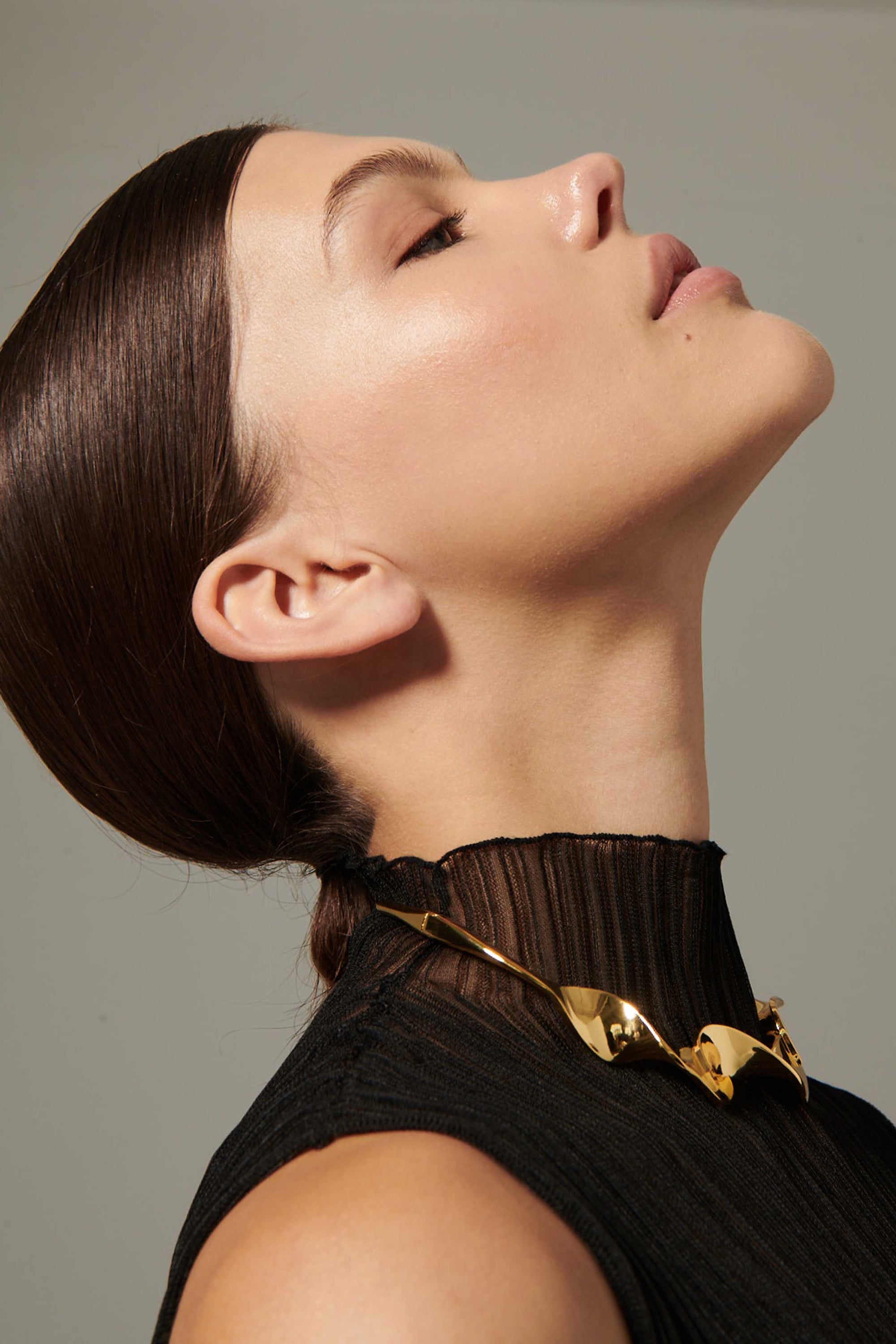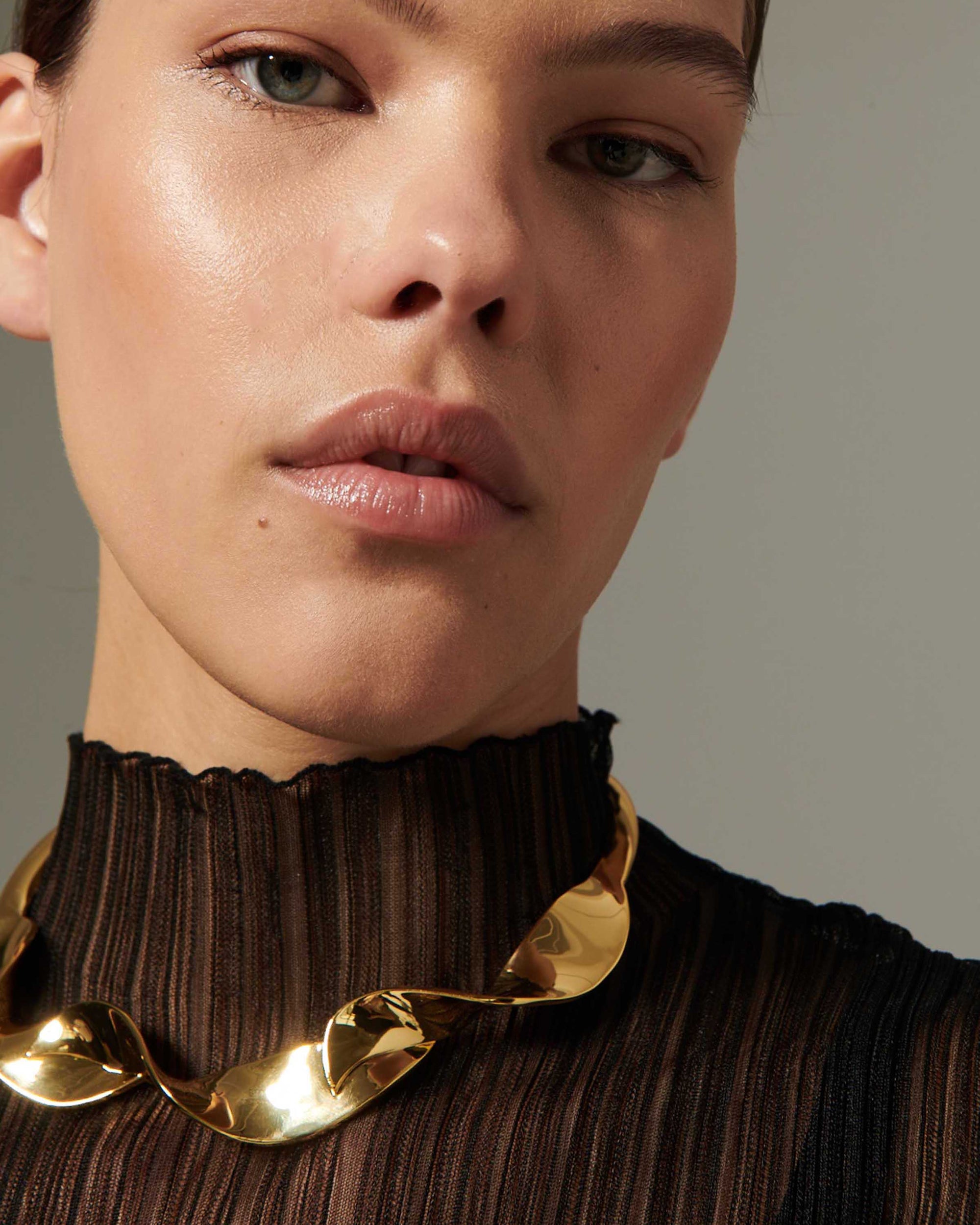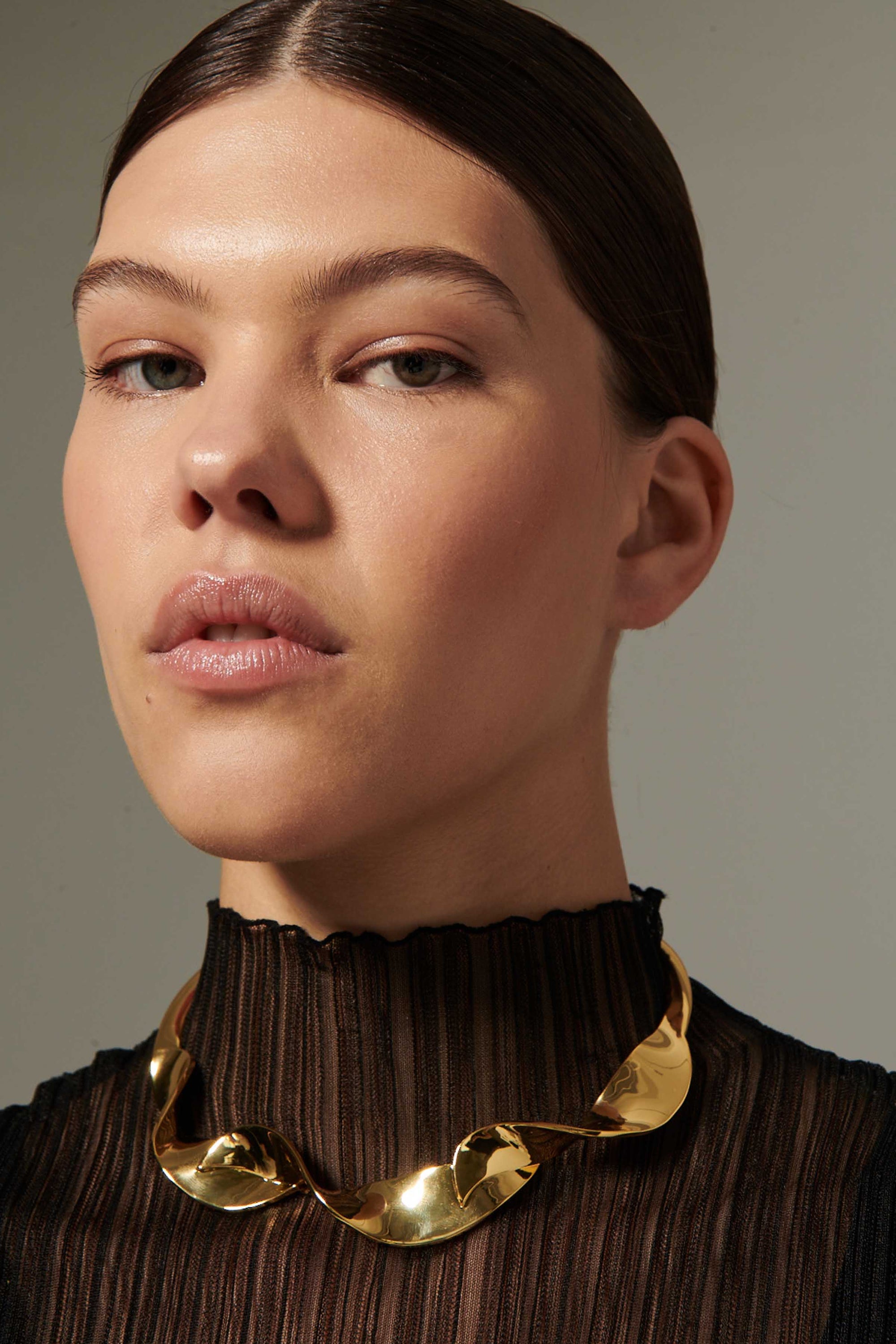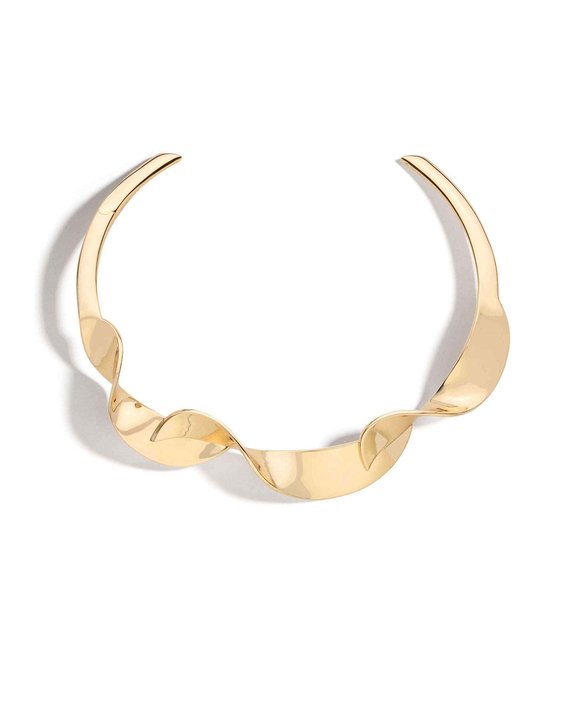 With a ribbon-like effect, this gold statement necklace doubles as an art piece.