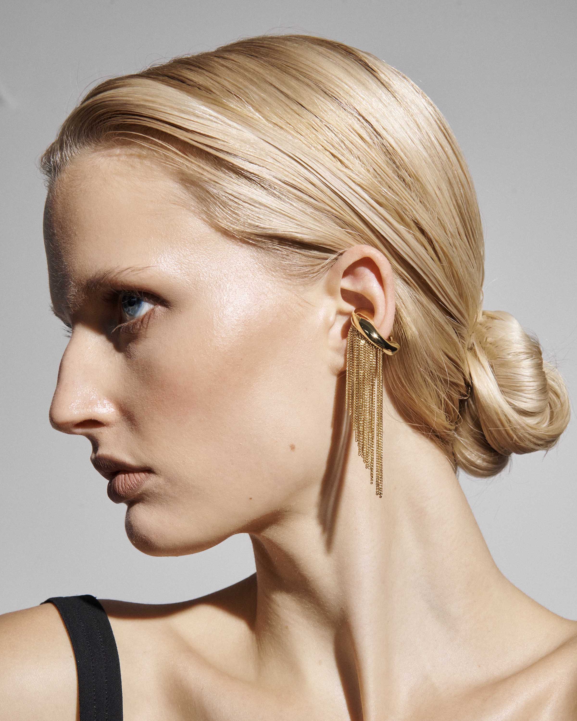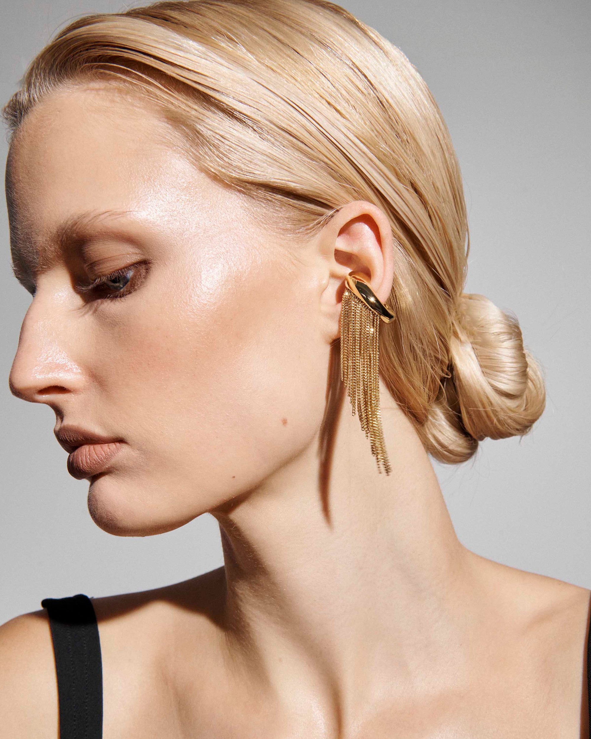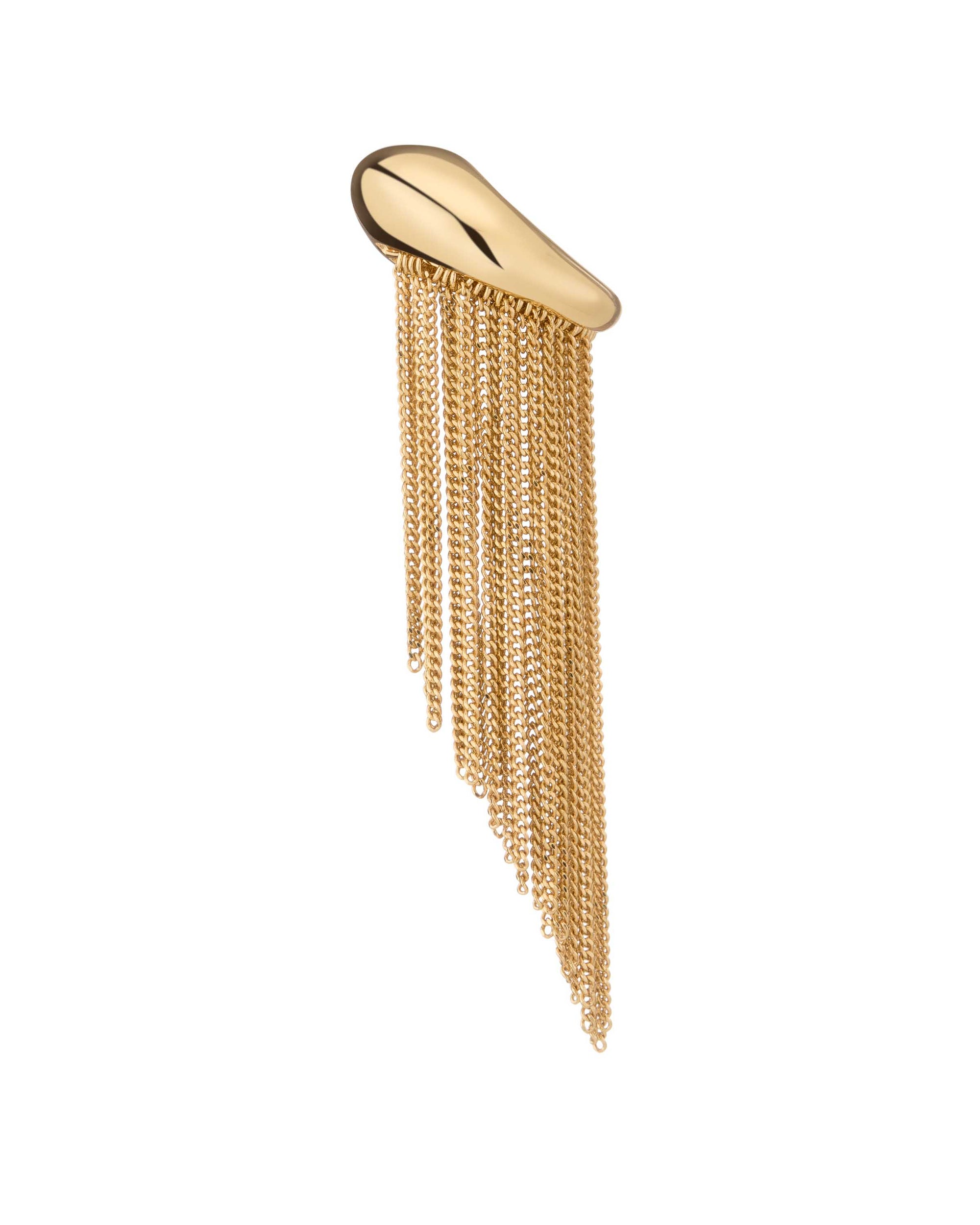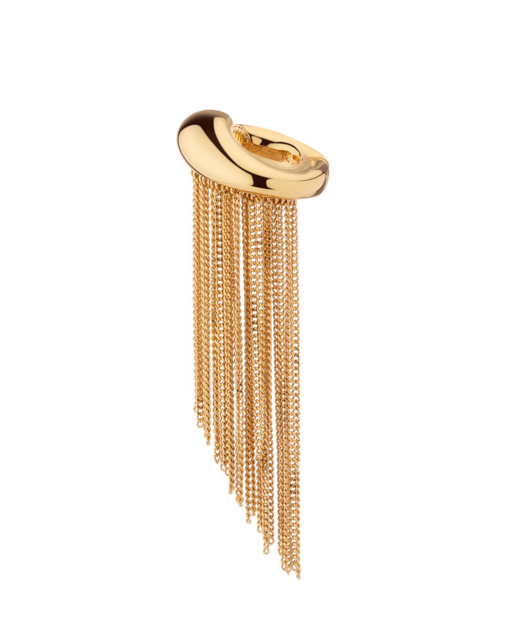 You can skip the earrings with this fun fringe moment. Bold and playful, this single piece chunky ear cuff with gold chain fringe adds a bit of edge to any look.