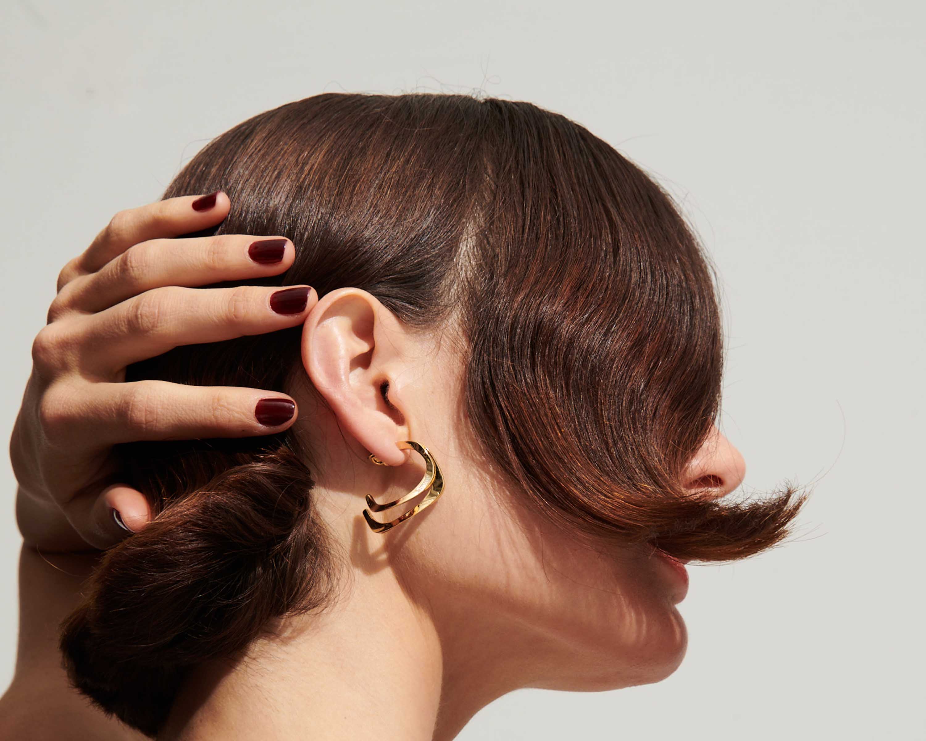 A classic hoop reinvented in an artistic shape. The Sandro features a twisted flat ribbon design with the illusion of wearing two stacked hoops.
