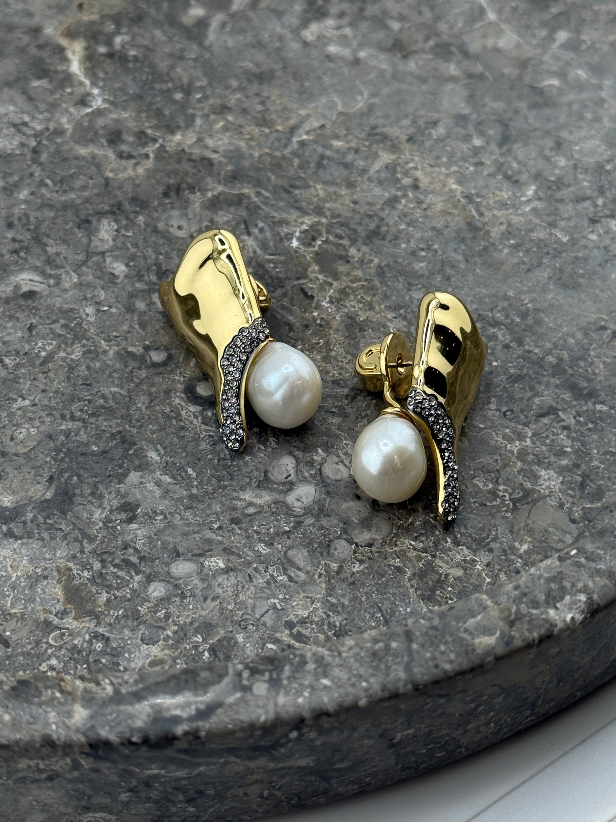 Uniquely elegant with a melting-like gold front piece that is bordered with shiny crystals, this special earring also encases a beautiful pearl that flashes from behind.