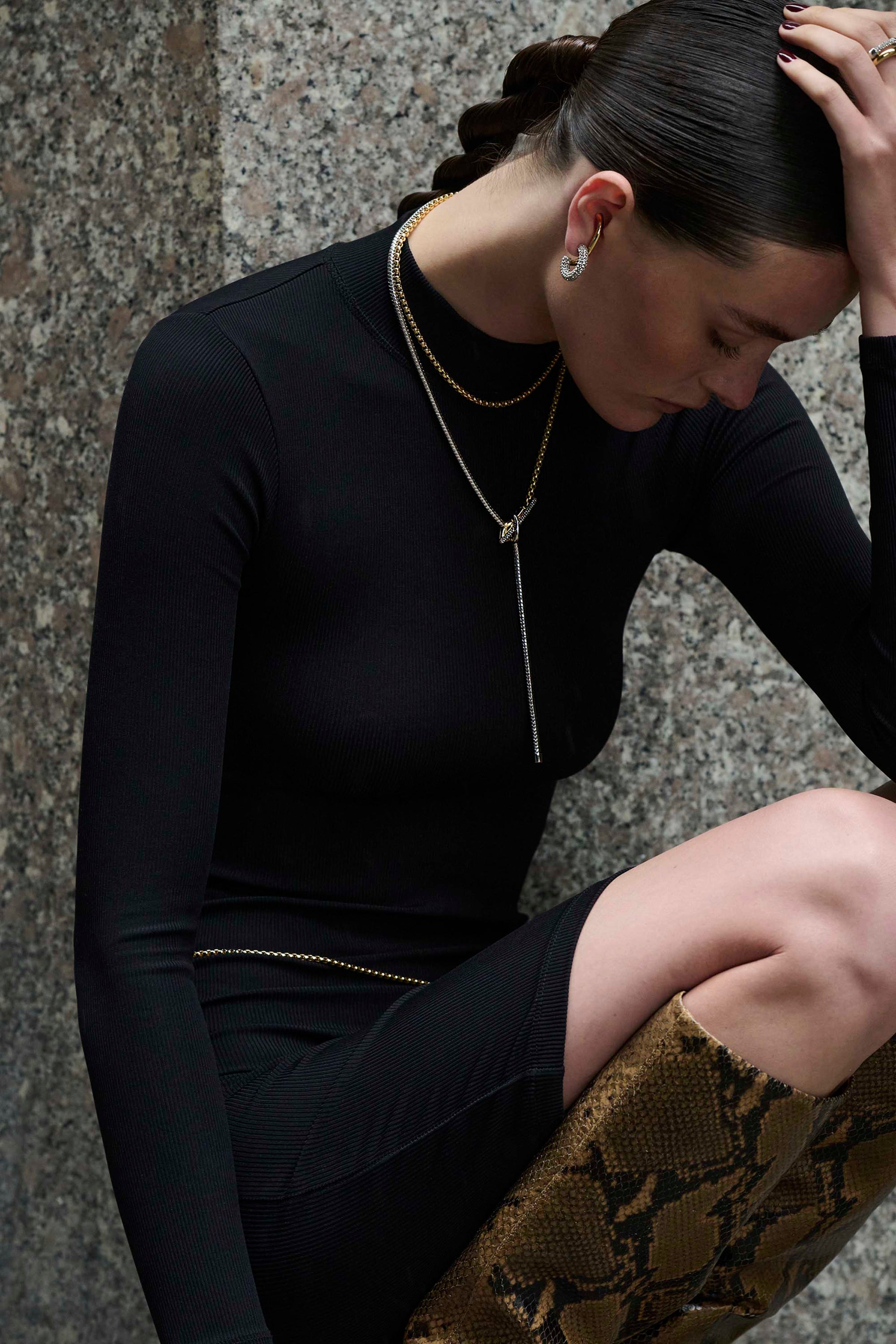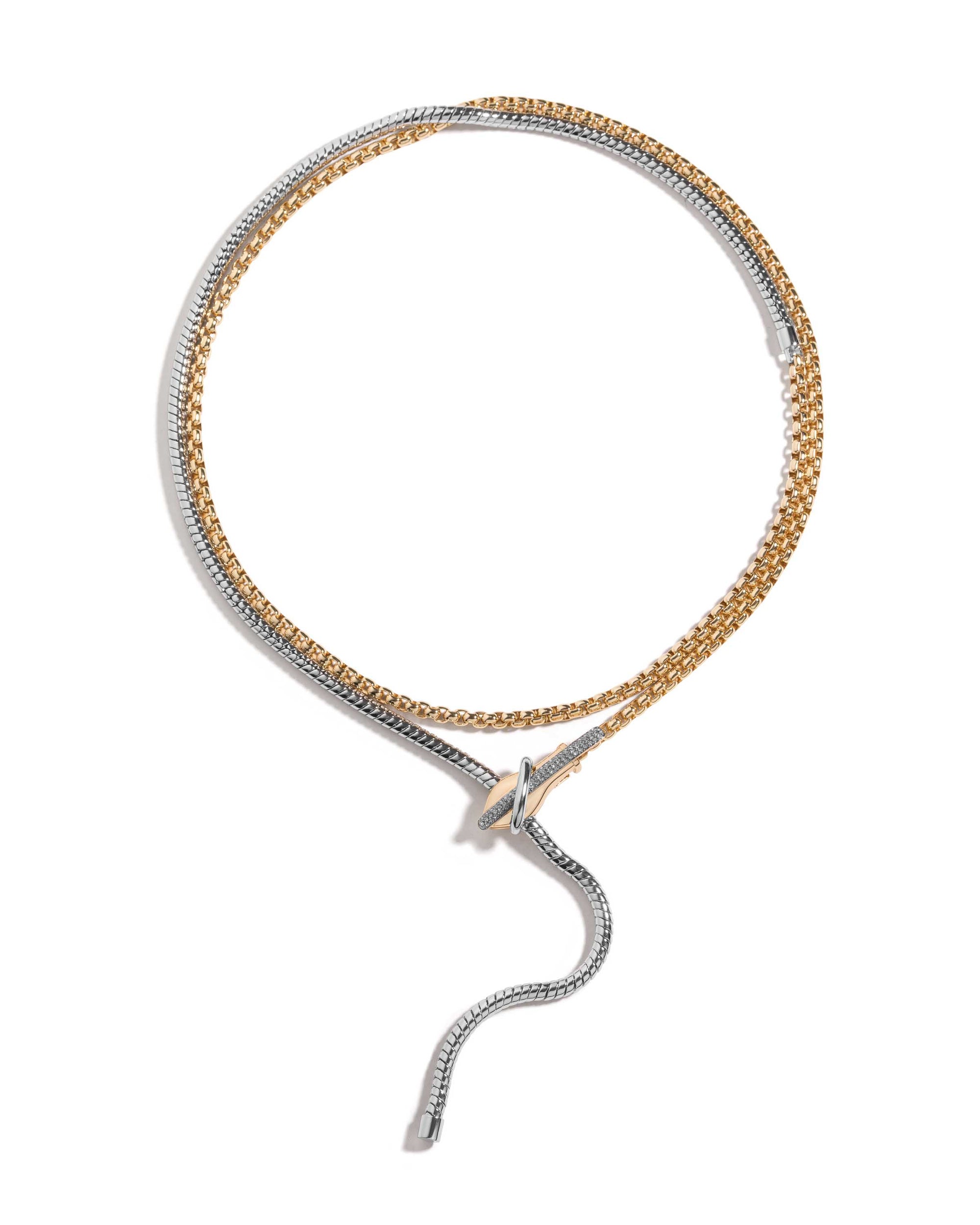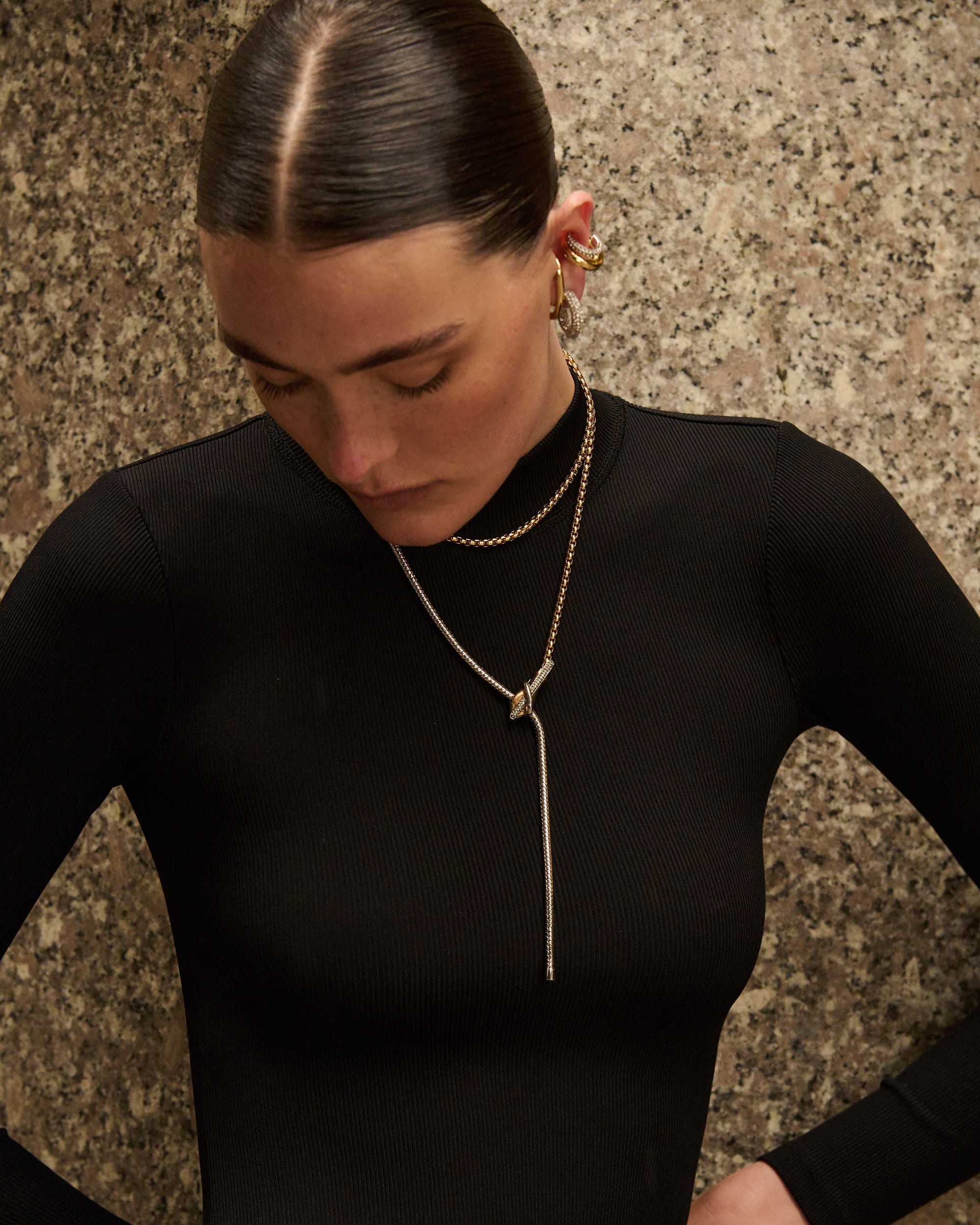 Make your own rules with this layered yet sophisticated necklace. The mixed metal Venom with its micro pavé touch blends textures and tones seamlessly creating an eye-catching statement. Play with the length and wear it your way.