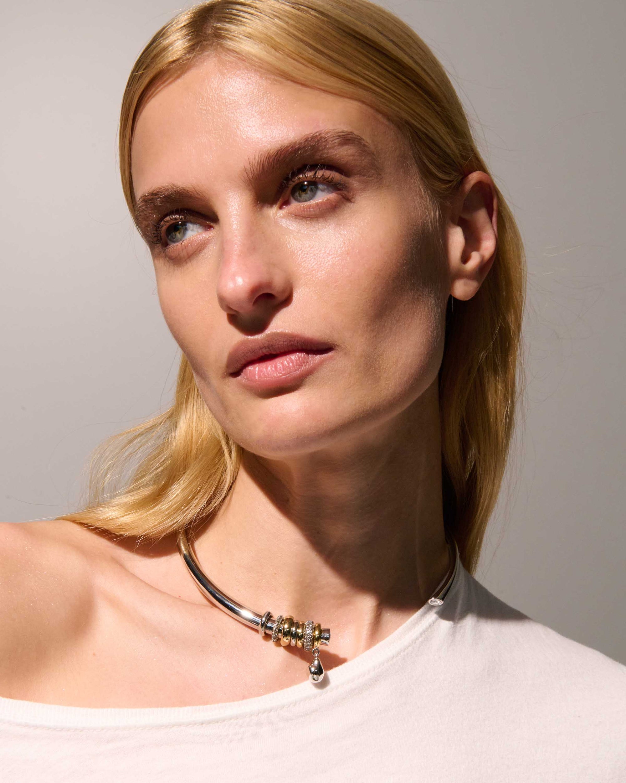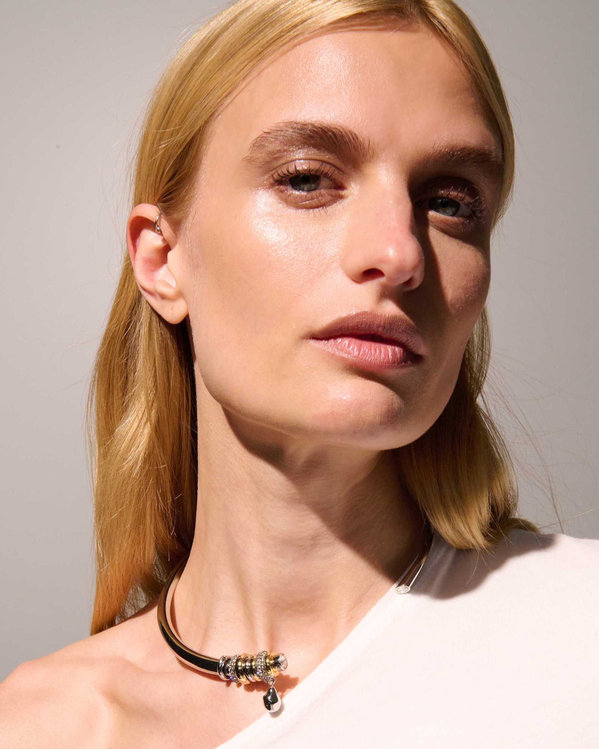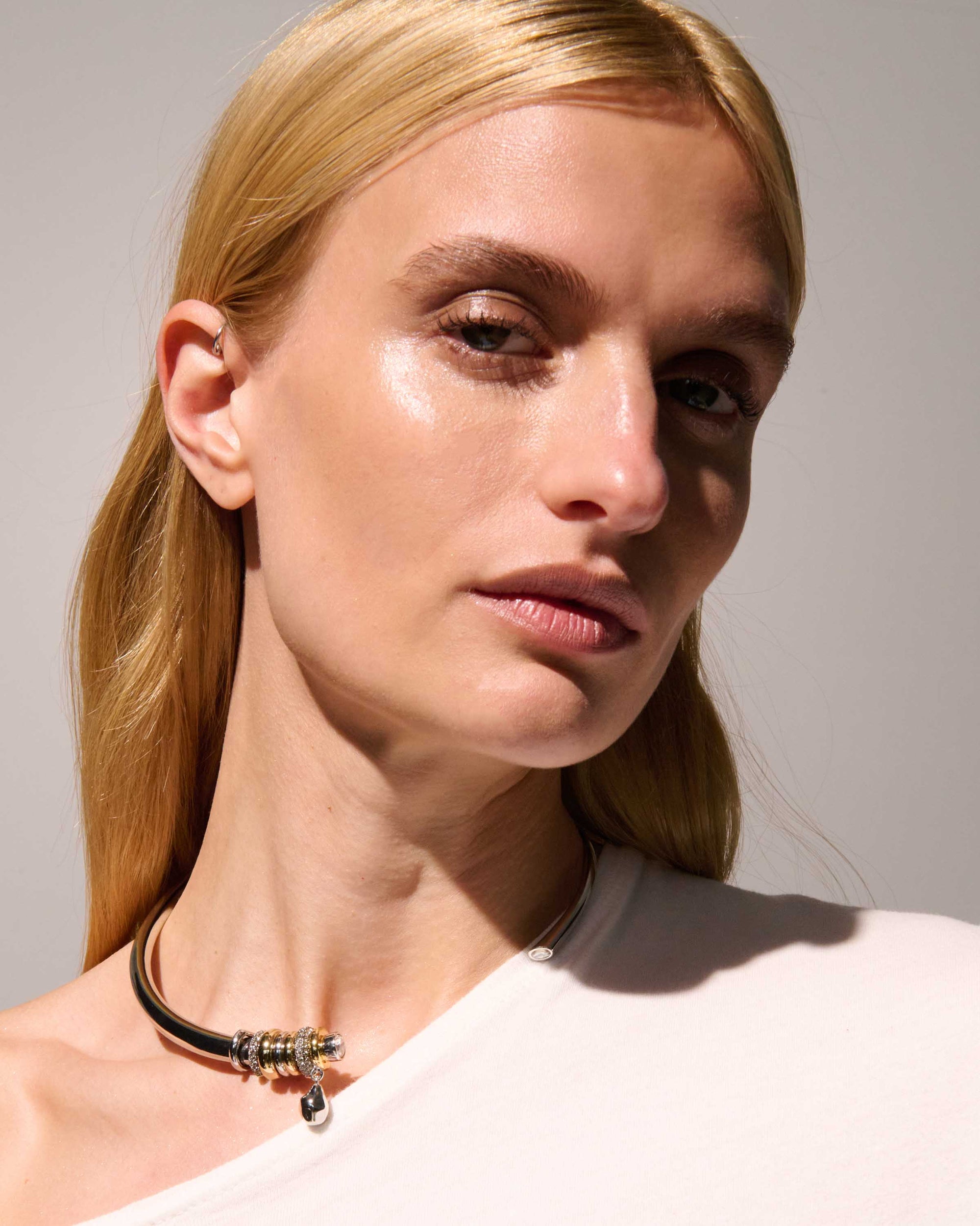 Elegant yet edgy, this showstopper exudes confidence. With a subtle mixed metal finish and pavé crystal details, this statement piece feels like wearable art.