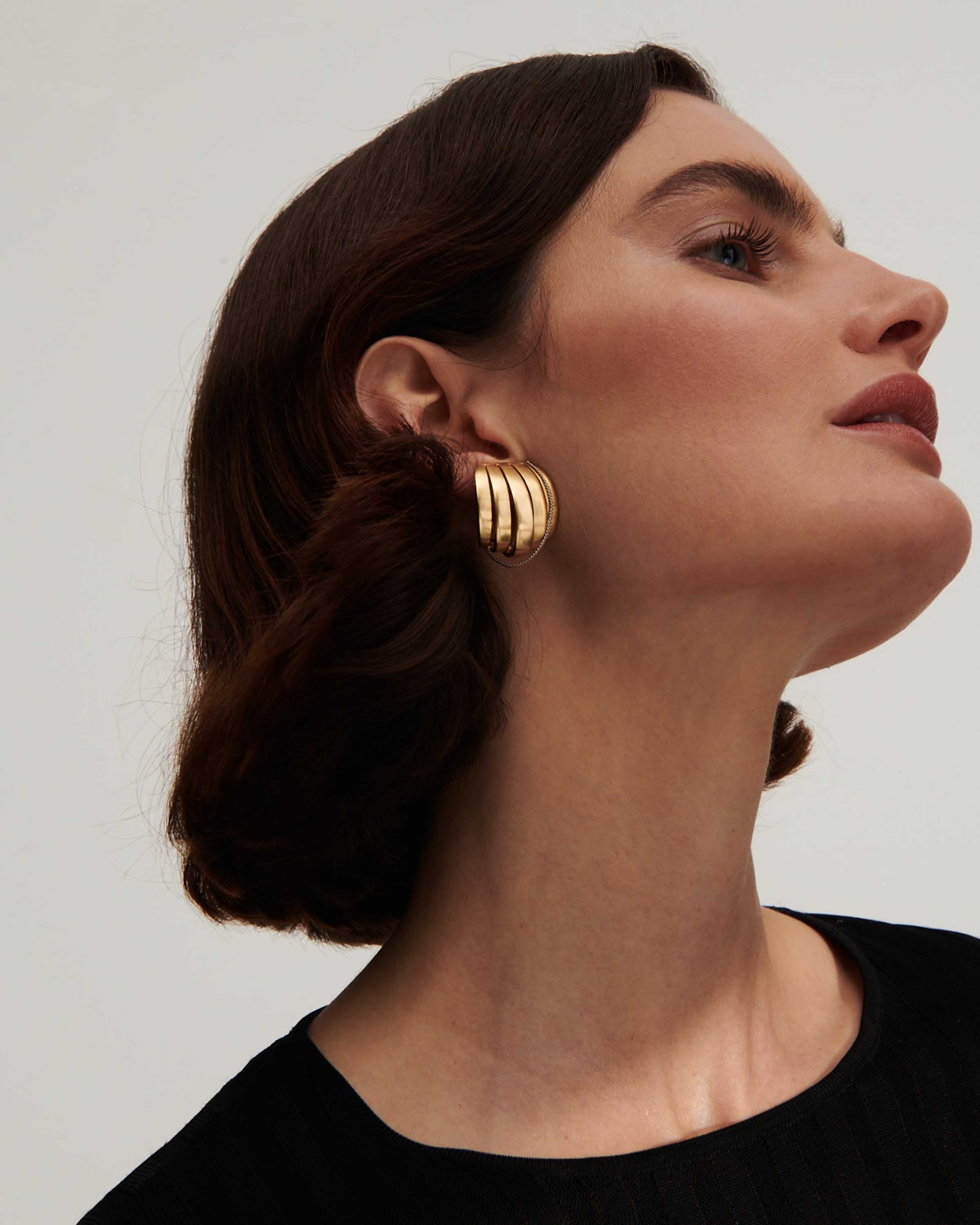 With a soft brushed gold effect and a thin silver hanging chain, this statement earring is inspired by the vintage statement earrings of the past.