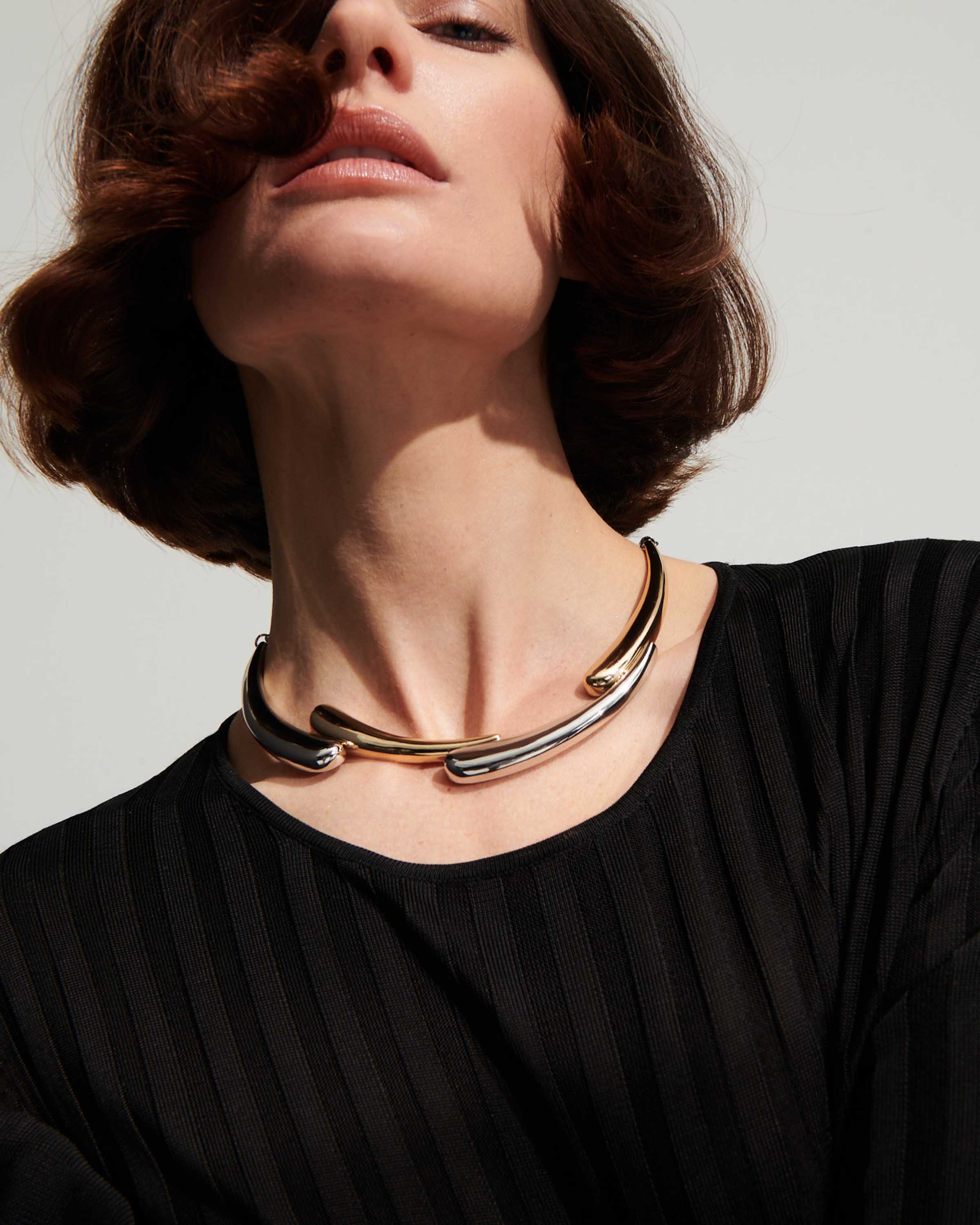 Featuring a motif that invokes movement, this necklace invites all the attention. Channel your inner confident Aries with this statement two tone necklace. Designed to be folded flat to be able to pack compactly.