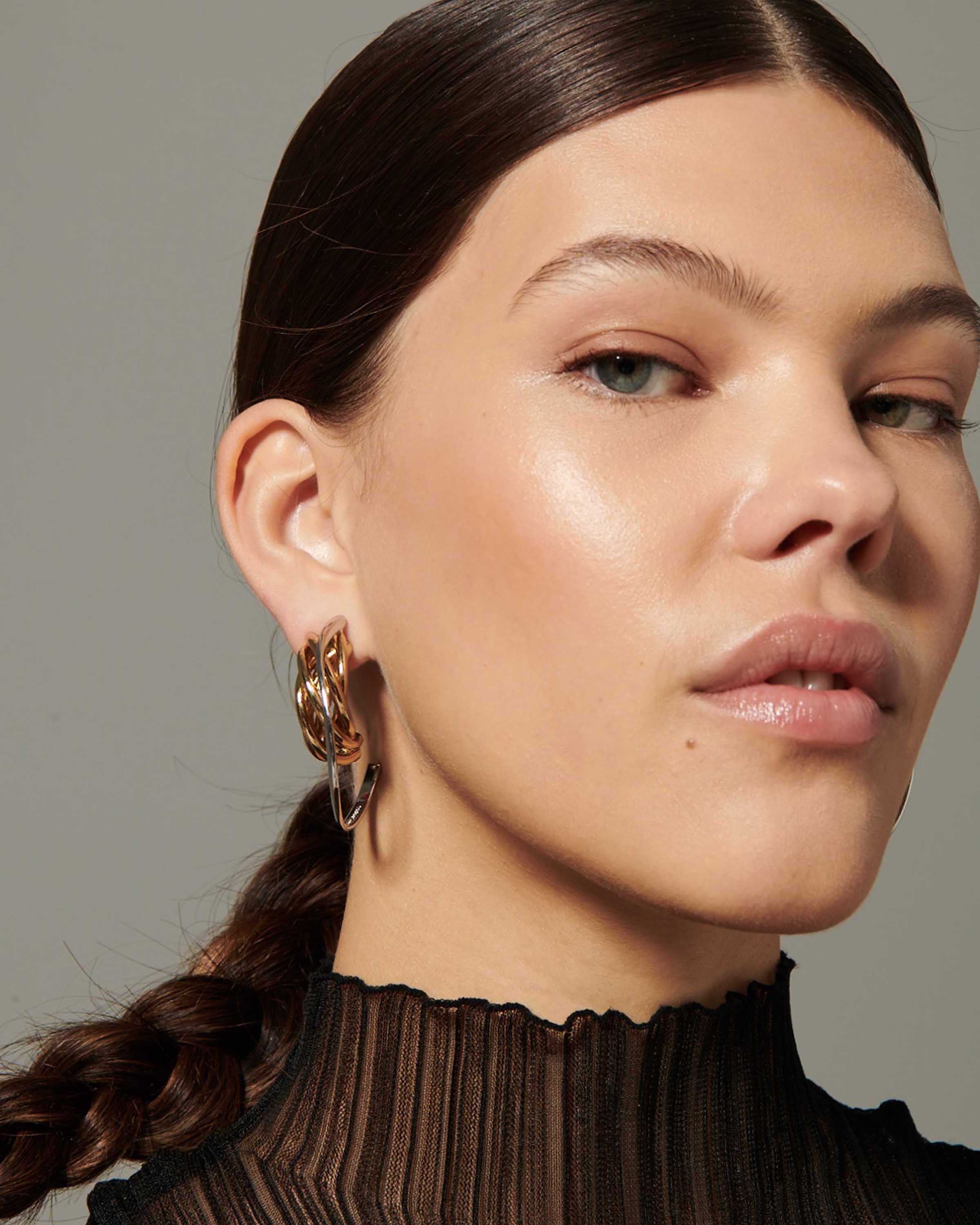 A unique double hoop earring silhouette featuring a classic thick gold hoop with a silver curve added on top.