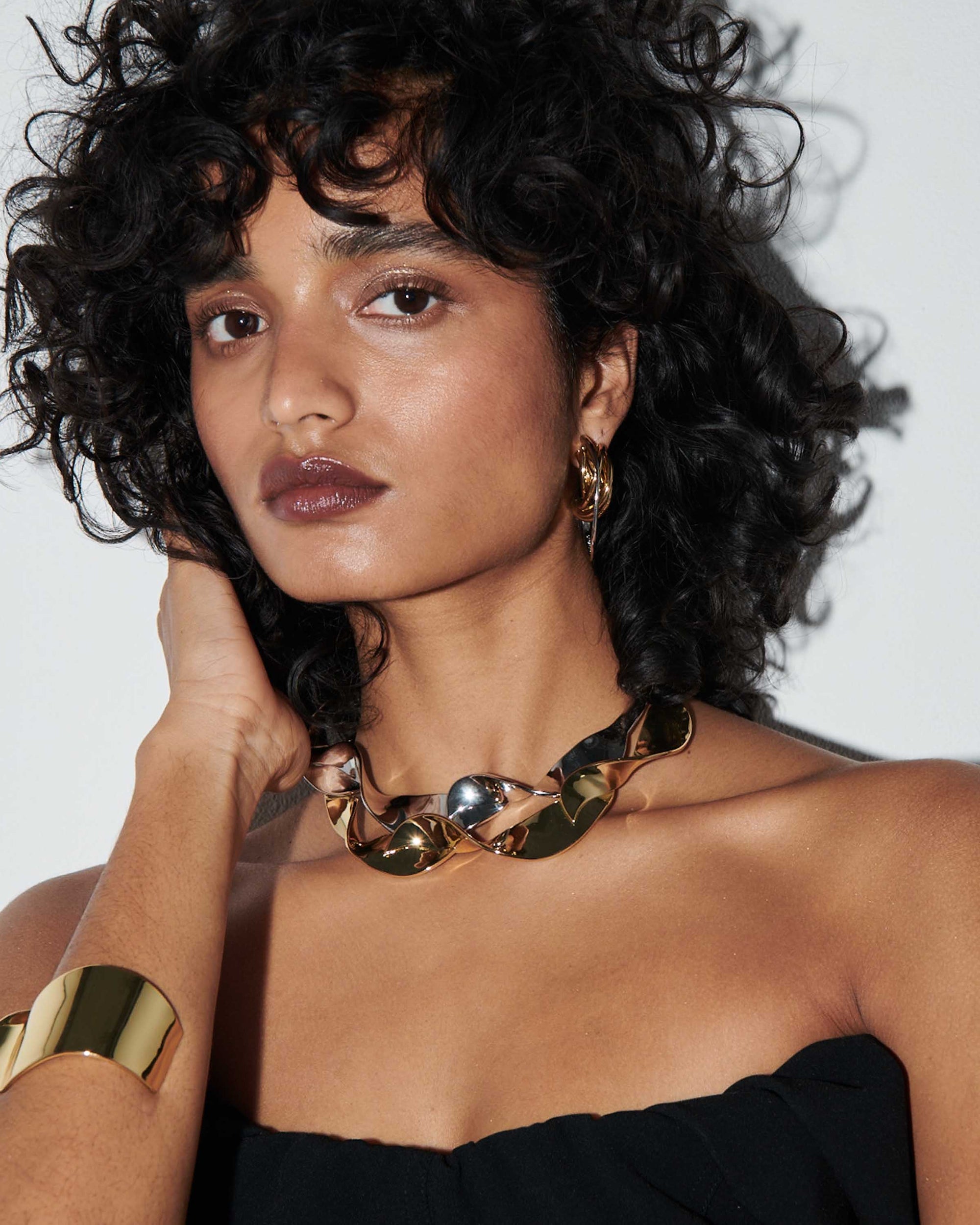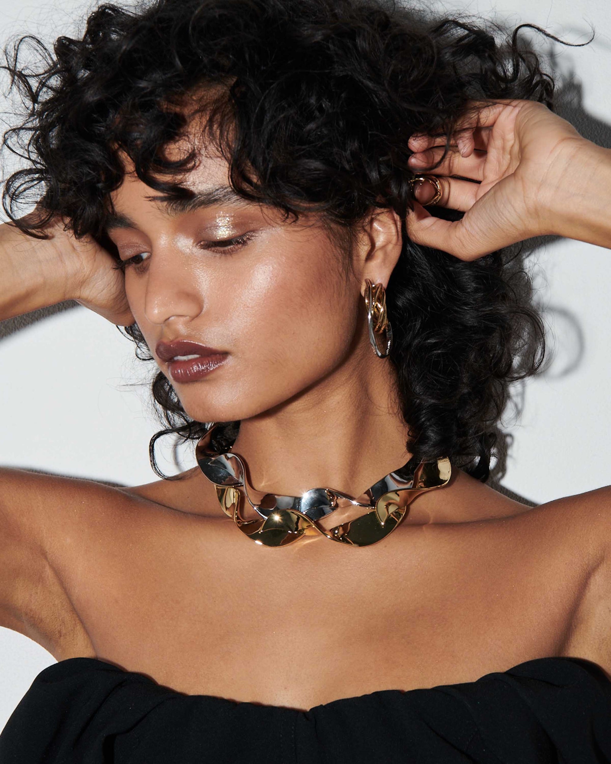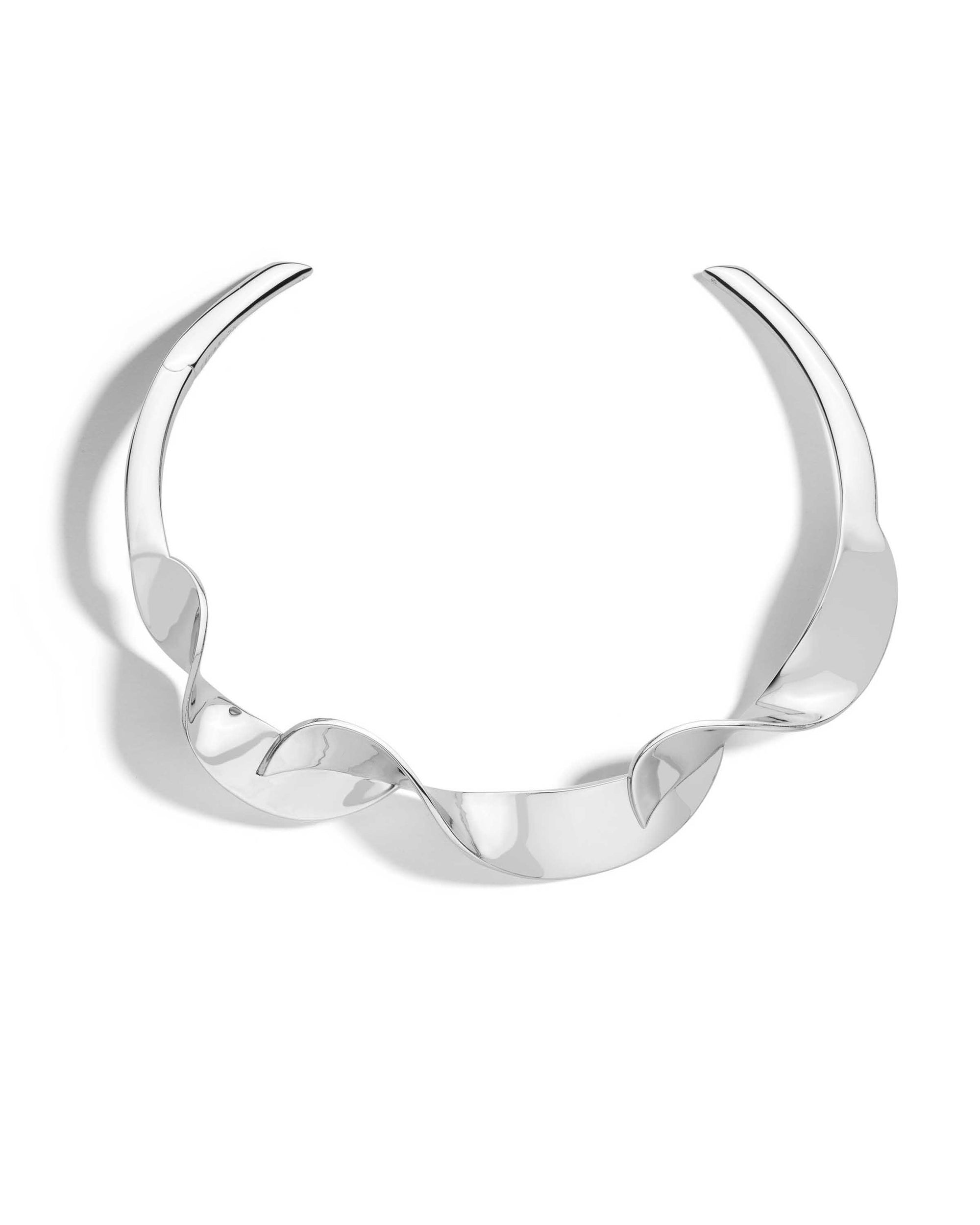 With a ribbon-like effect, this silver statement necklace doubles as an art piece.