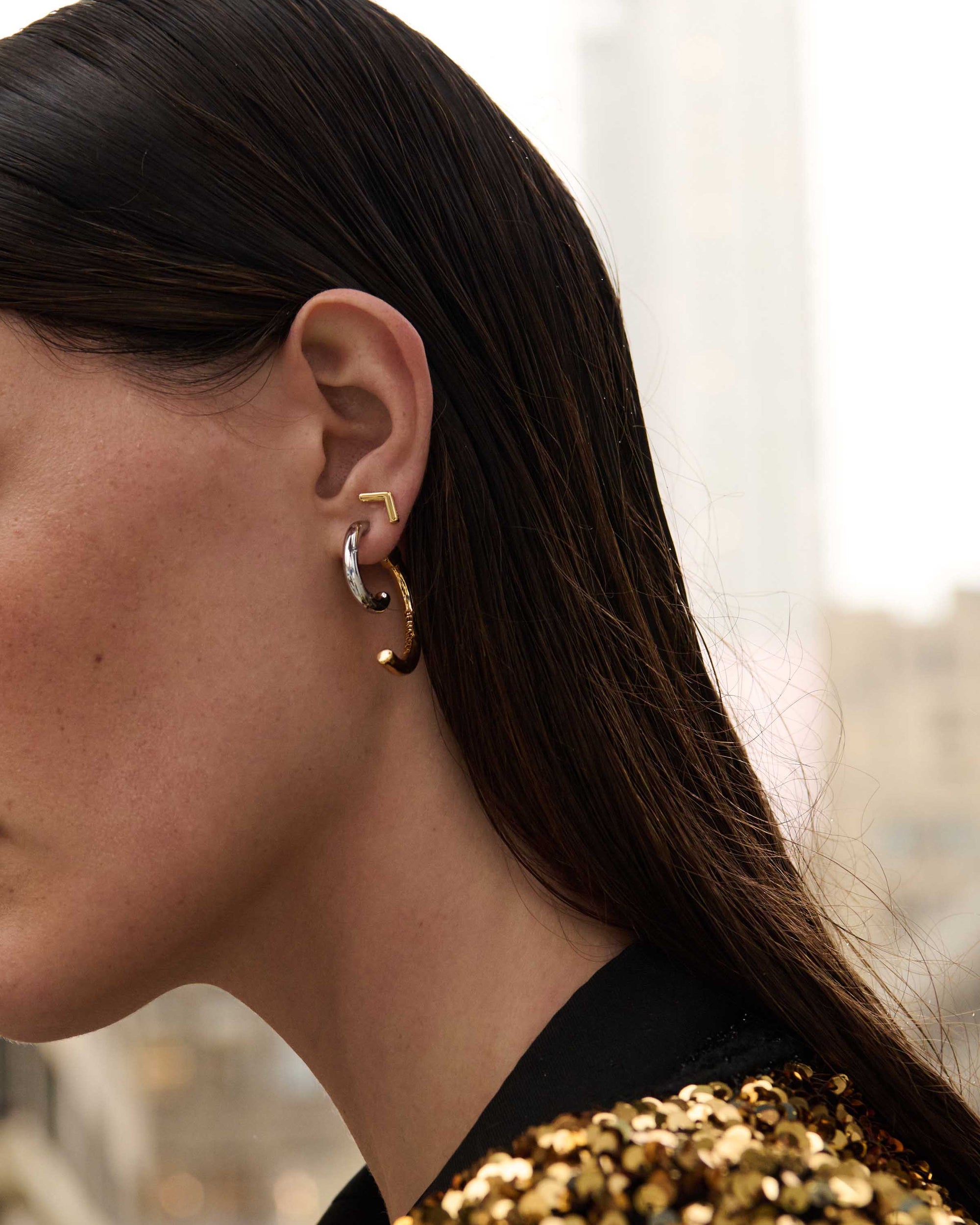 12k gold plated and silver rhodium plated earring set. This unique earring can be worn above the ear lobe or worn down for a dangle effect.