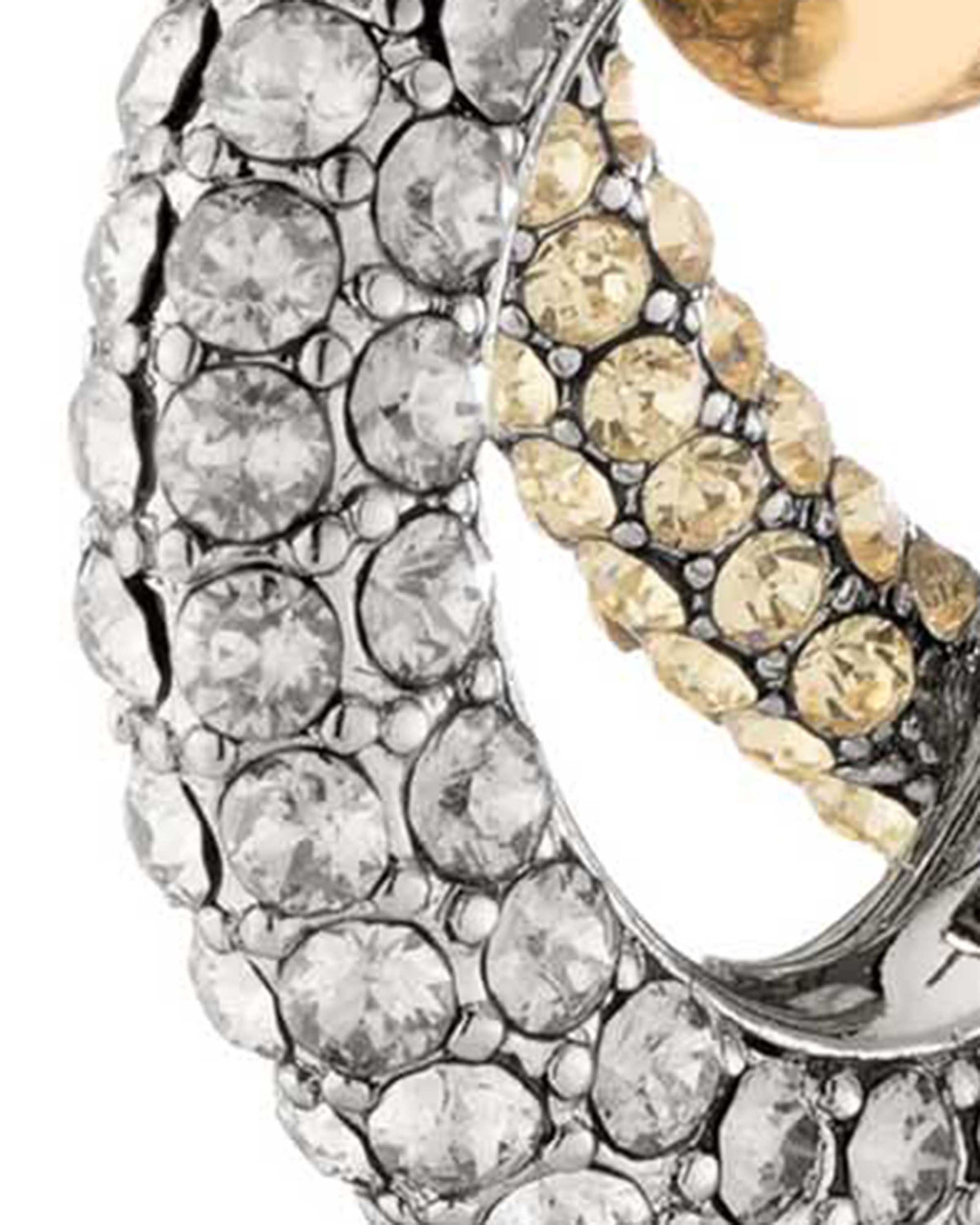 Our new Pavé Two Tone collection imitates our distinctive two tone classics with radiant pavé stones in multi dimensional sizes. Think silver and gold translated in luminous crystals. This bold Luna earring is made to dazzle even with its mini size.