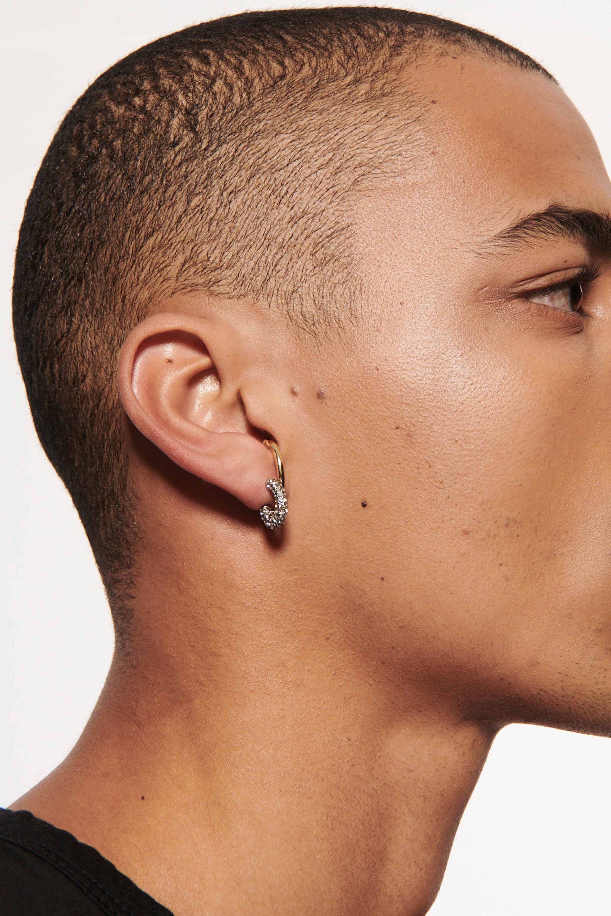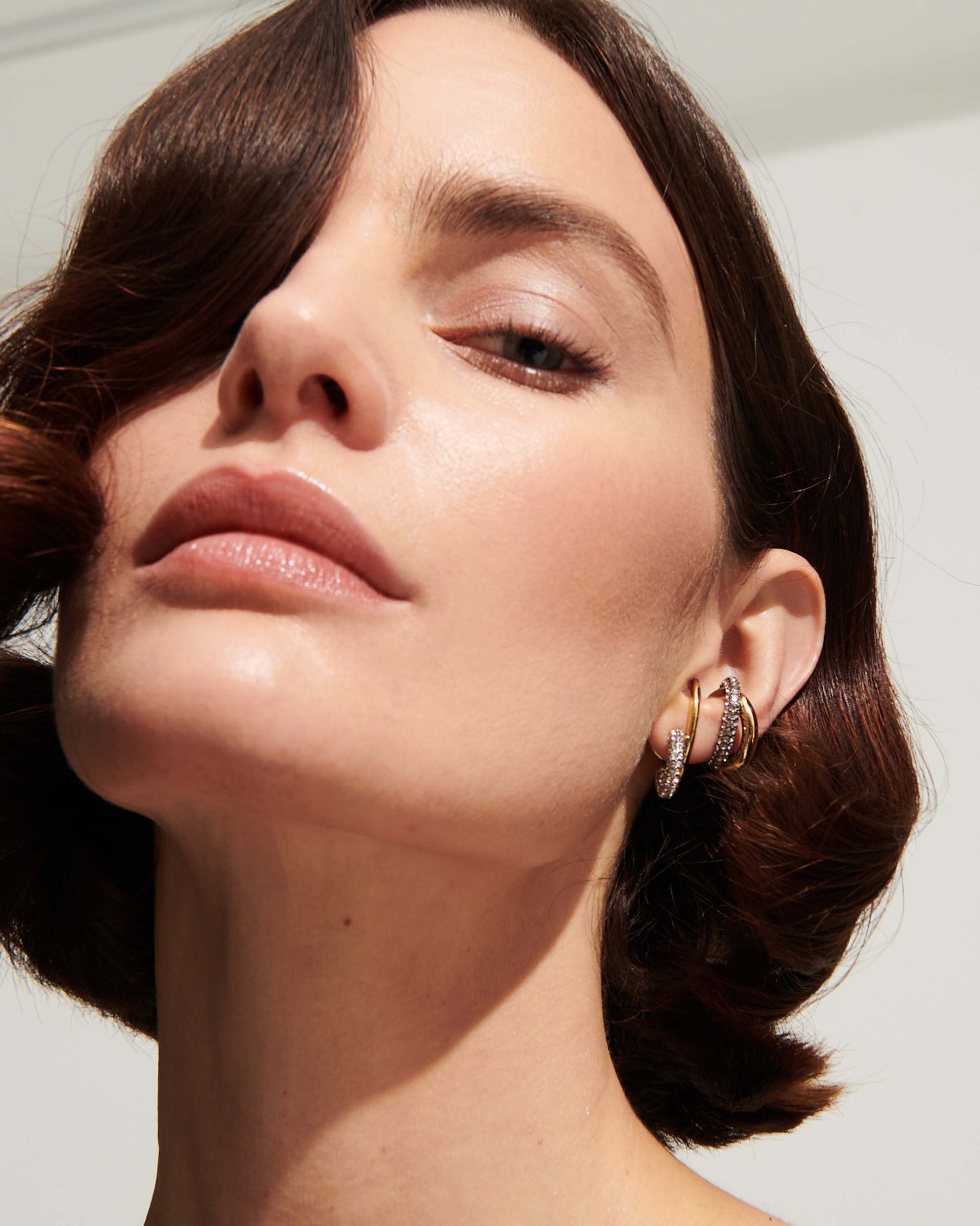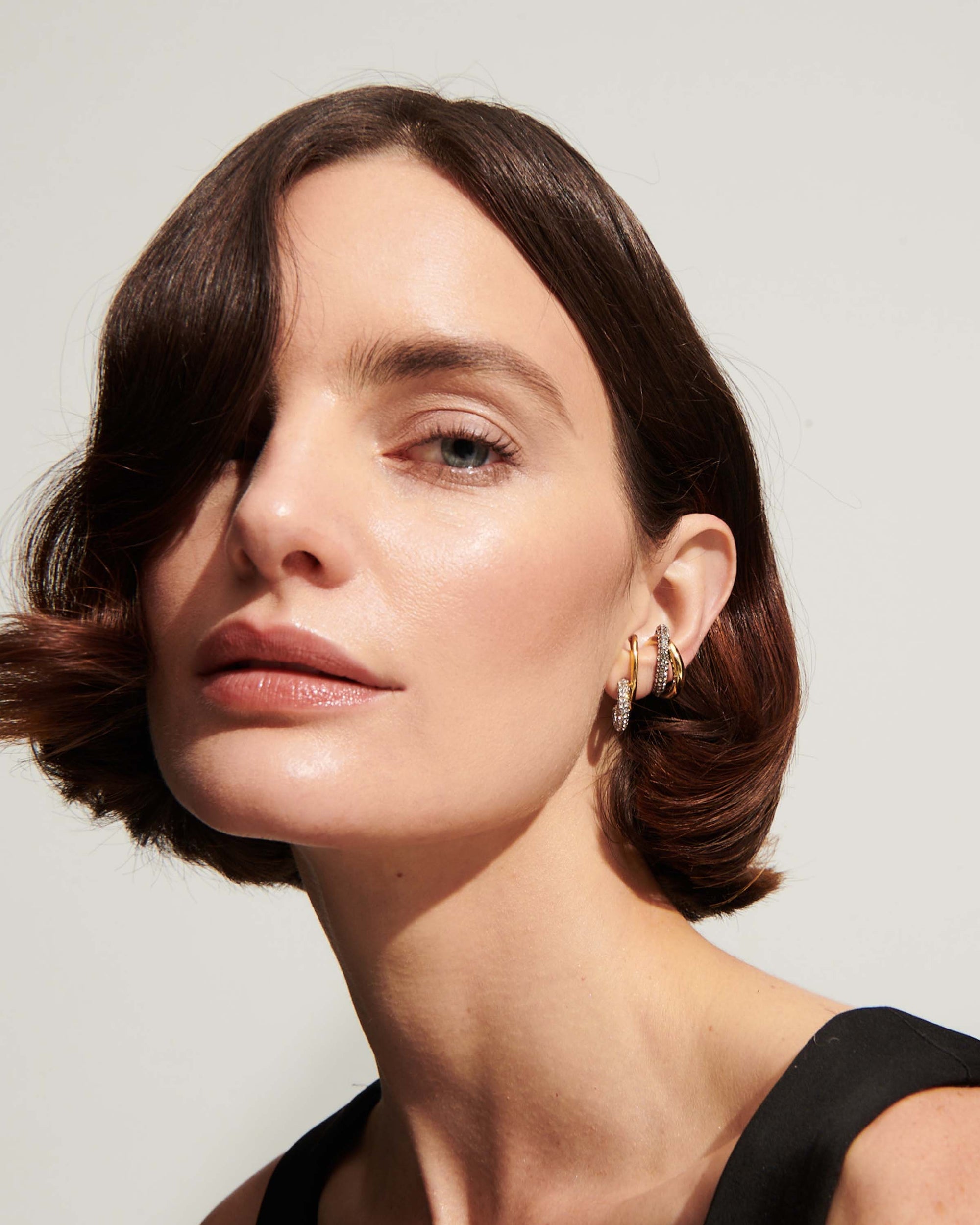 The mini version of our best-selling earrings. 12k shiny gold & pave crystal plated brass hoops with parallel vertical pave rings.