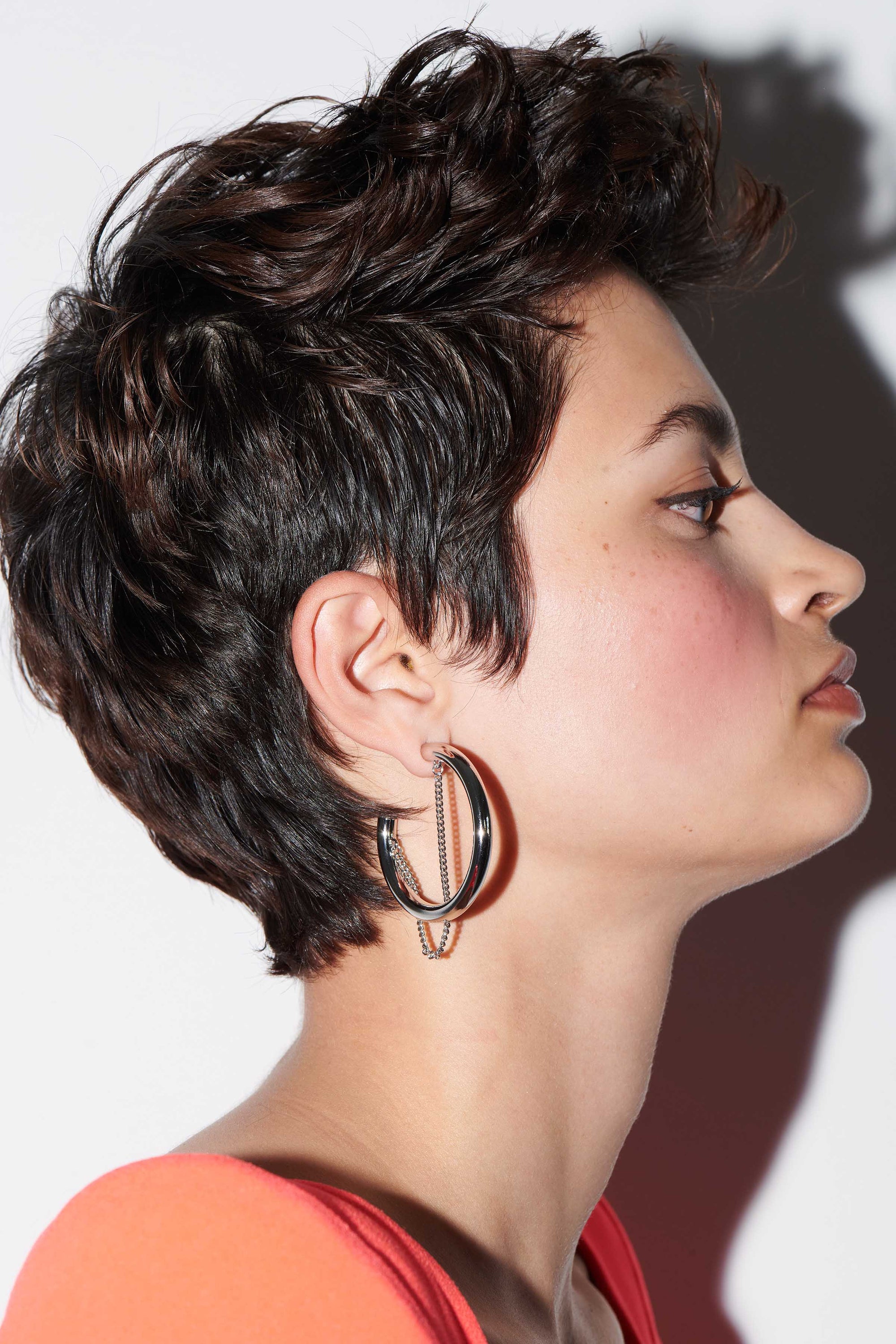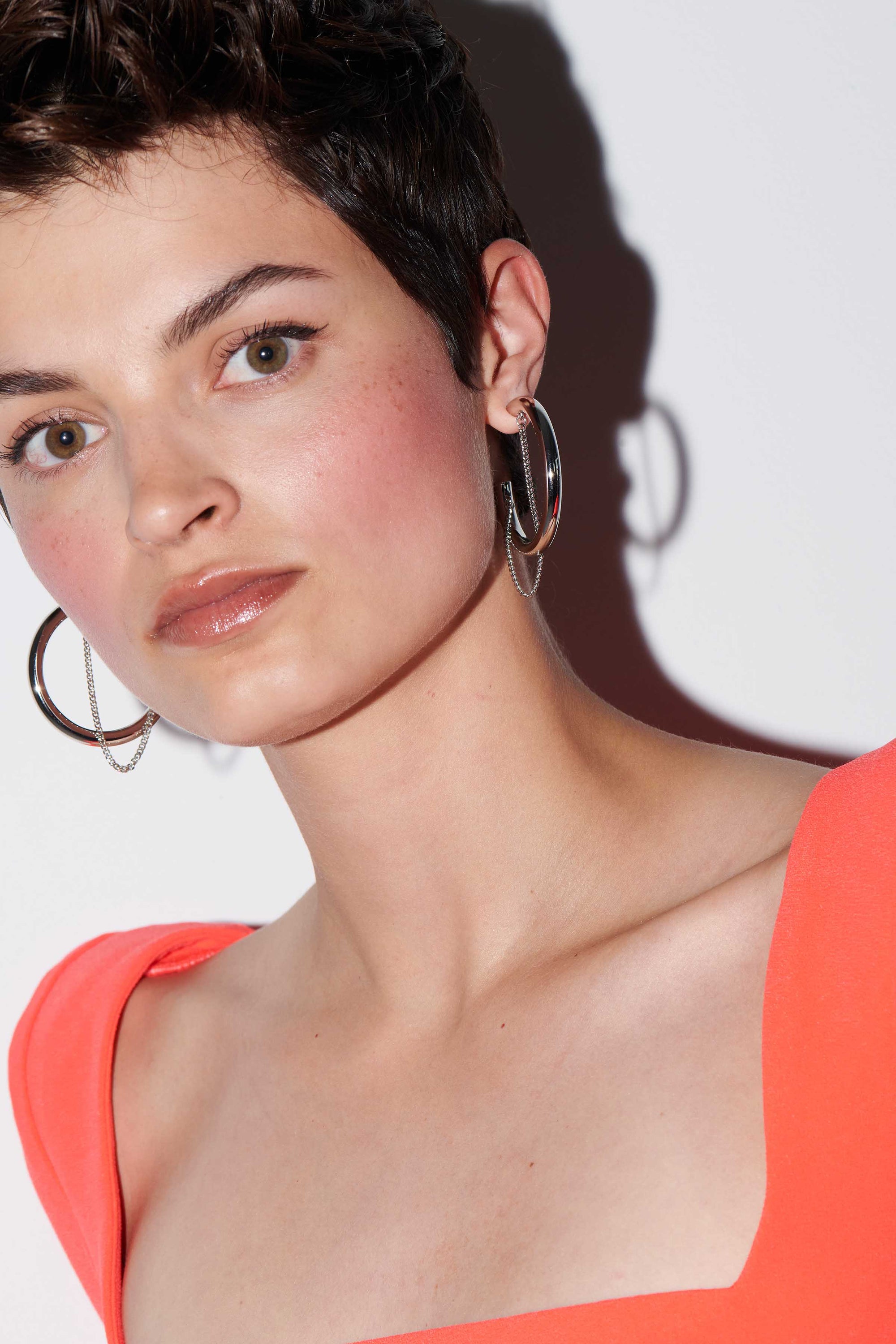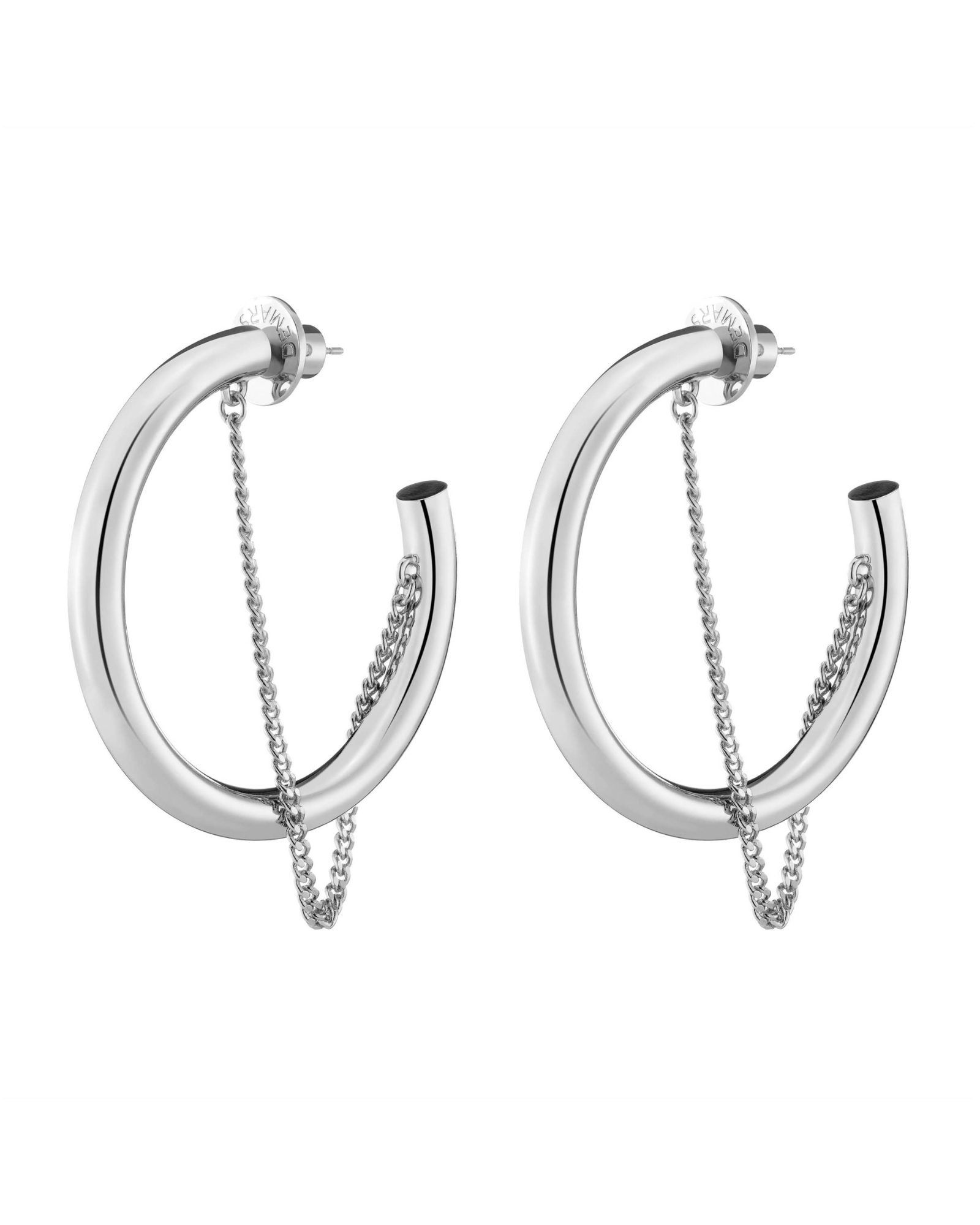 12k gold plated earring set with hanging chain accent. This lightweight design is the perfect size for everyday with signature logo engraving inside.