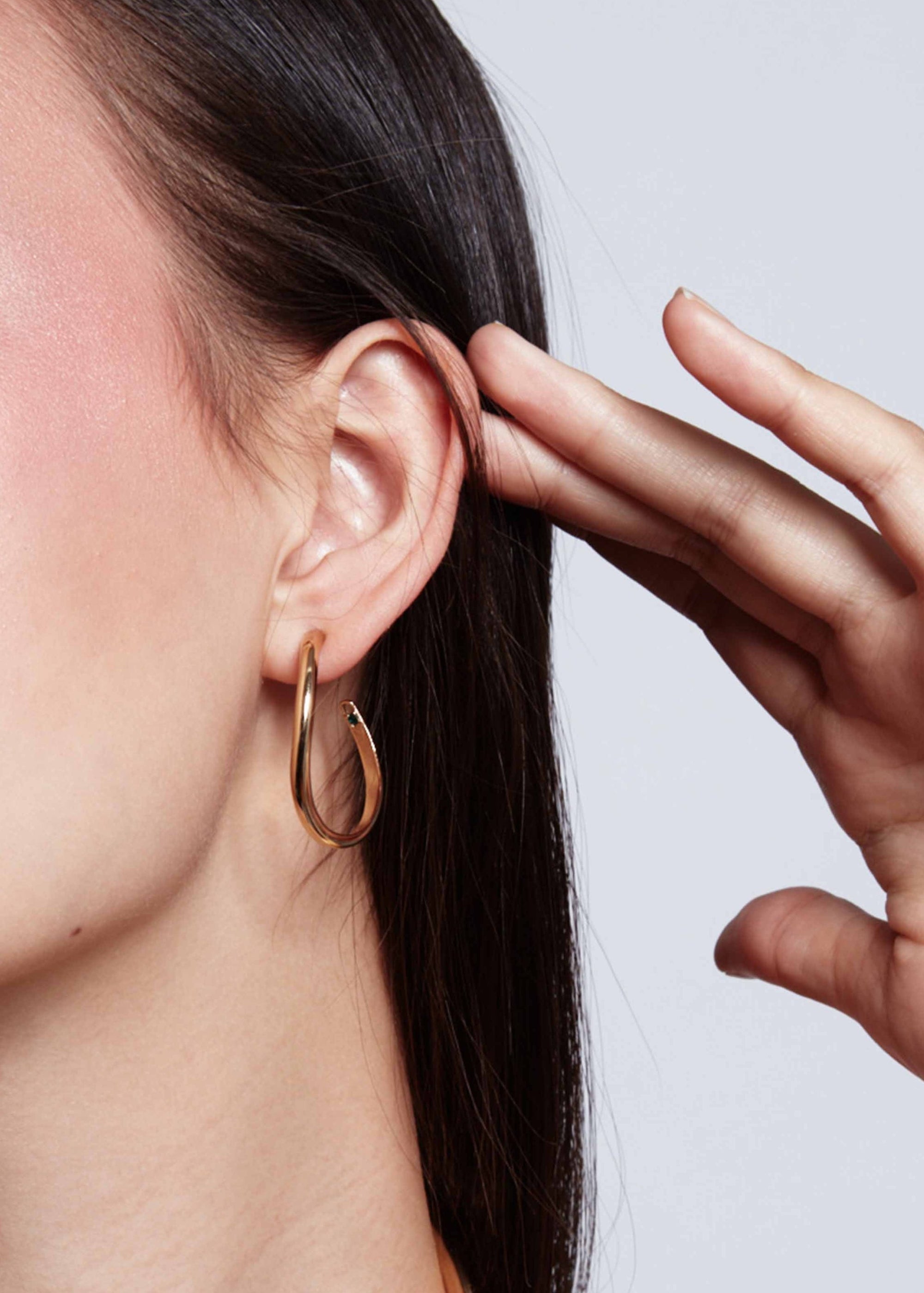 Lightweight 12k gold plated earring set with embedded emerald pavé crystal accents. This curved contour design has a modern shape with signature logo engraving inside.
