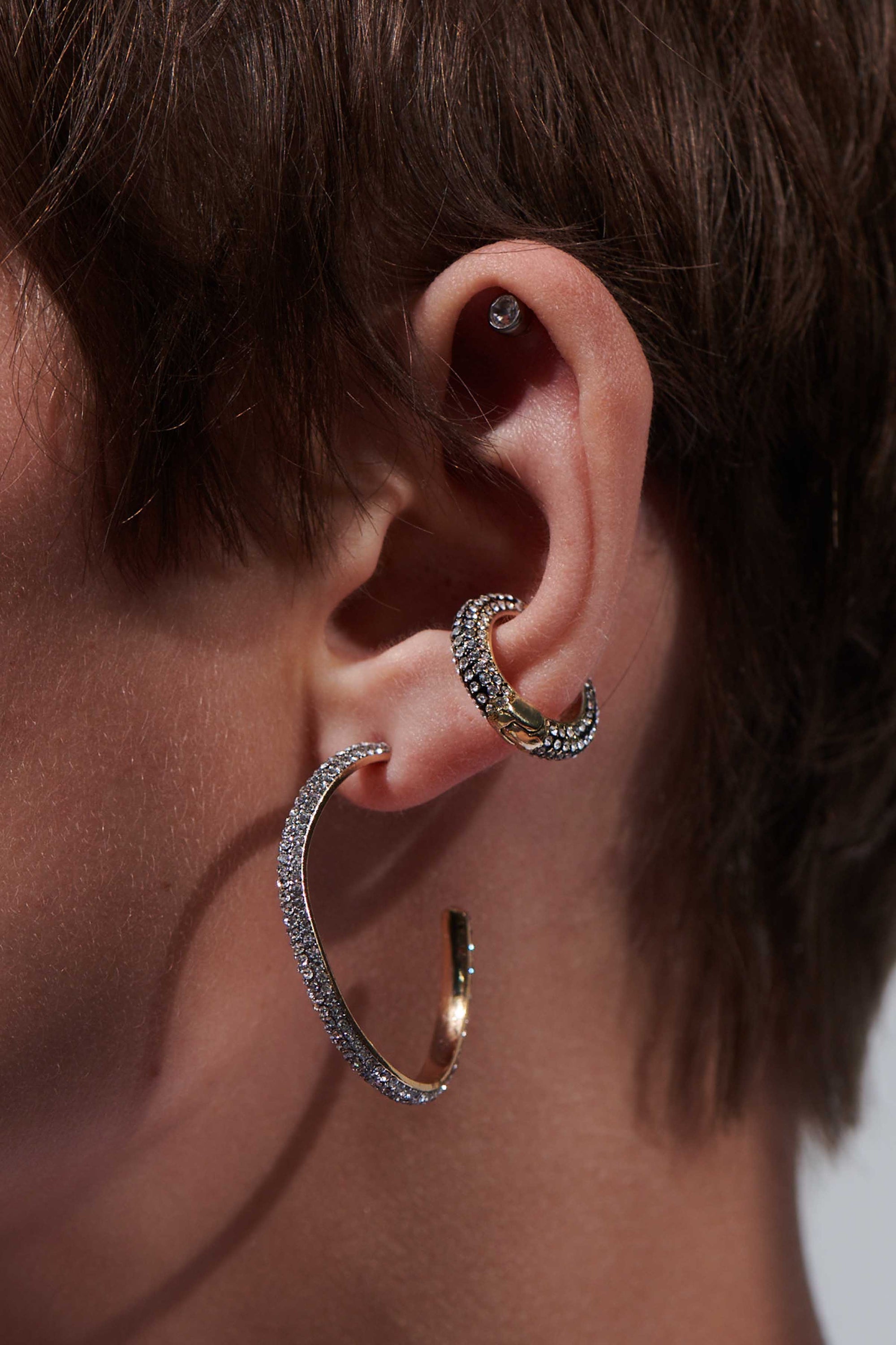Lightweight pavé crystal encrusted hoops lined with 12k gold. This curved contour design has a modern shape with signature logo engraving inside.
