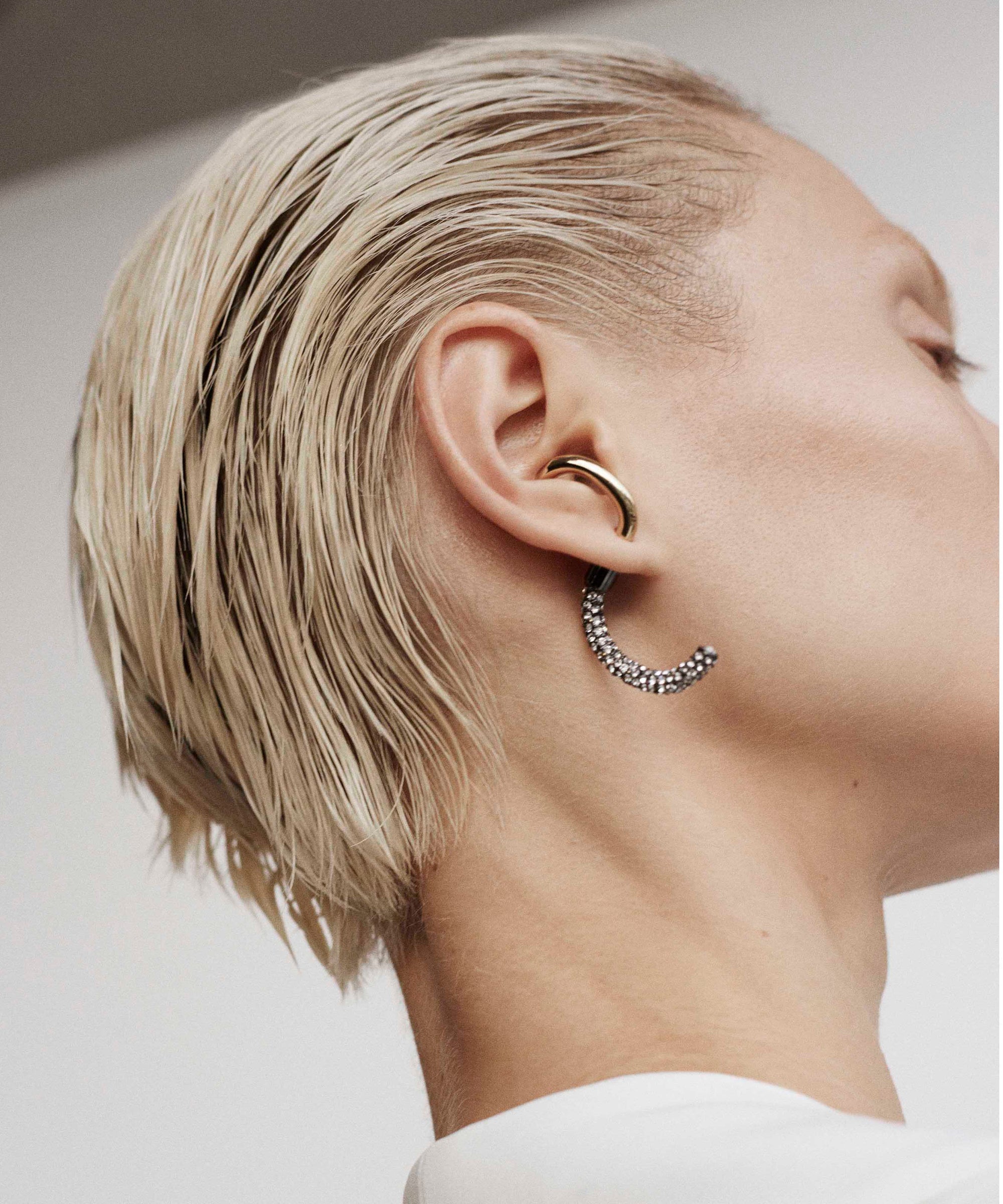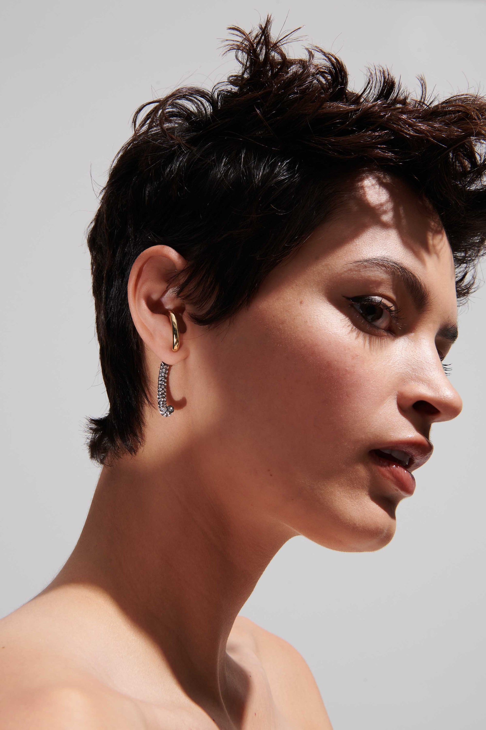 12k gold plated & gunmetal brass with encrusted crystal earring set. This unique earring can be worn above the ear lobe or worn down for a dangle effect.