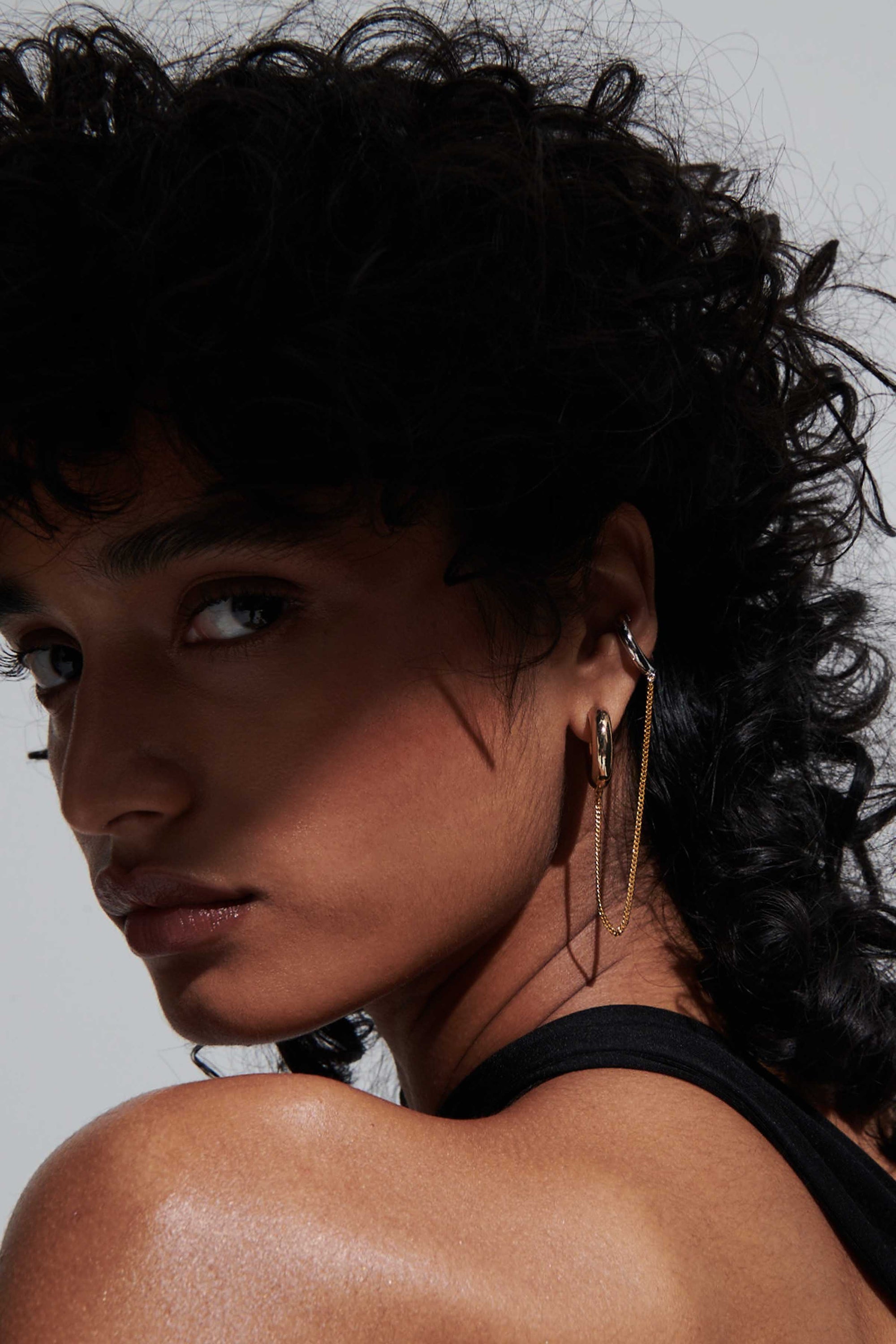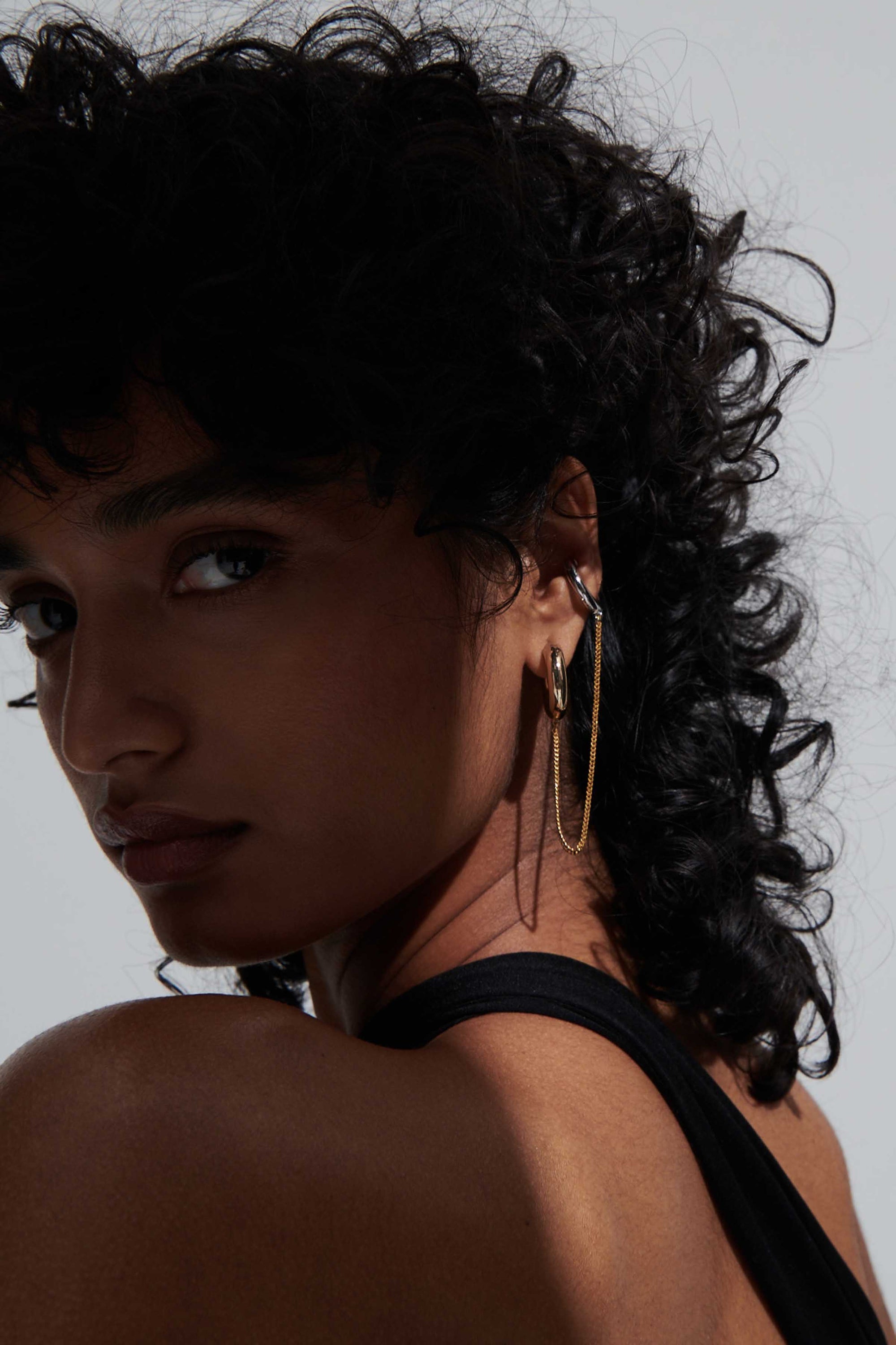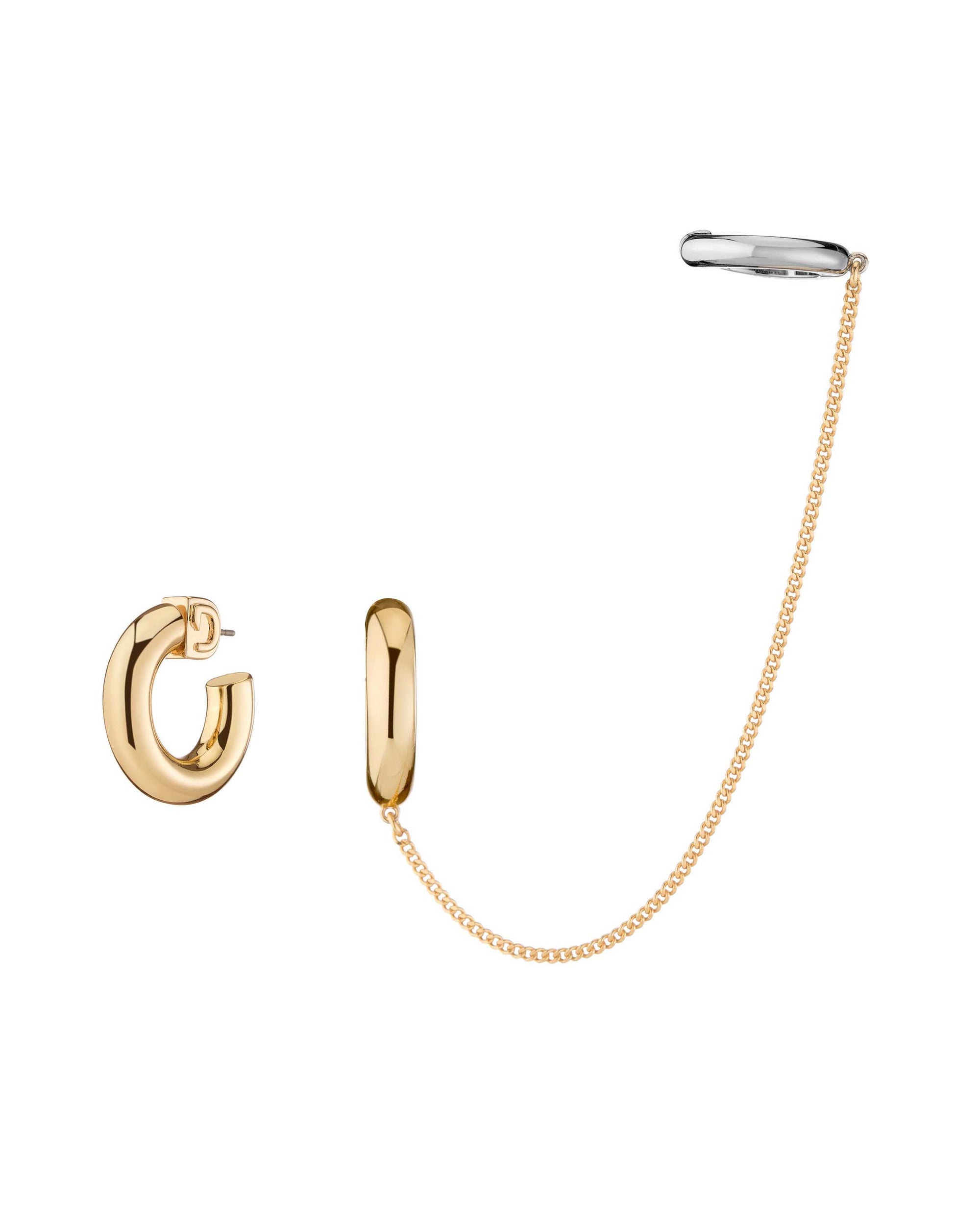This unique mini hoop earring set includes a single gold chain and earring cuff for a playful, asymmetric look.