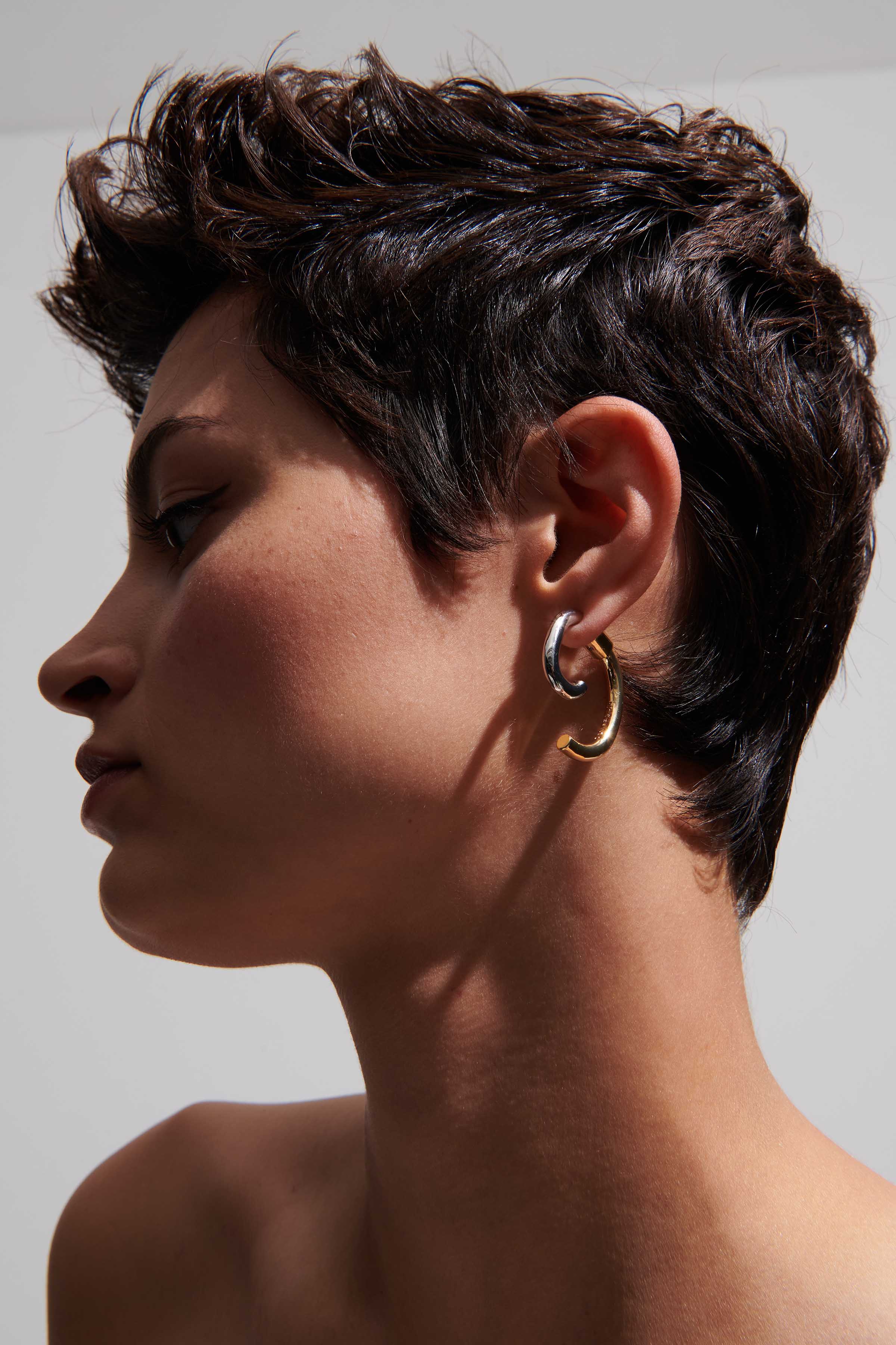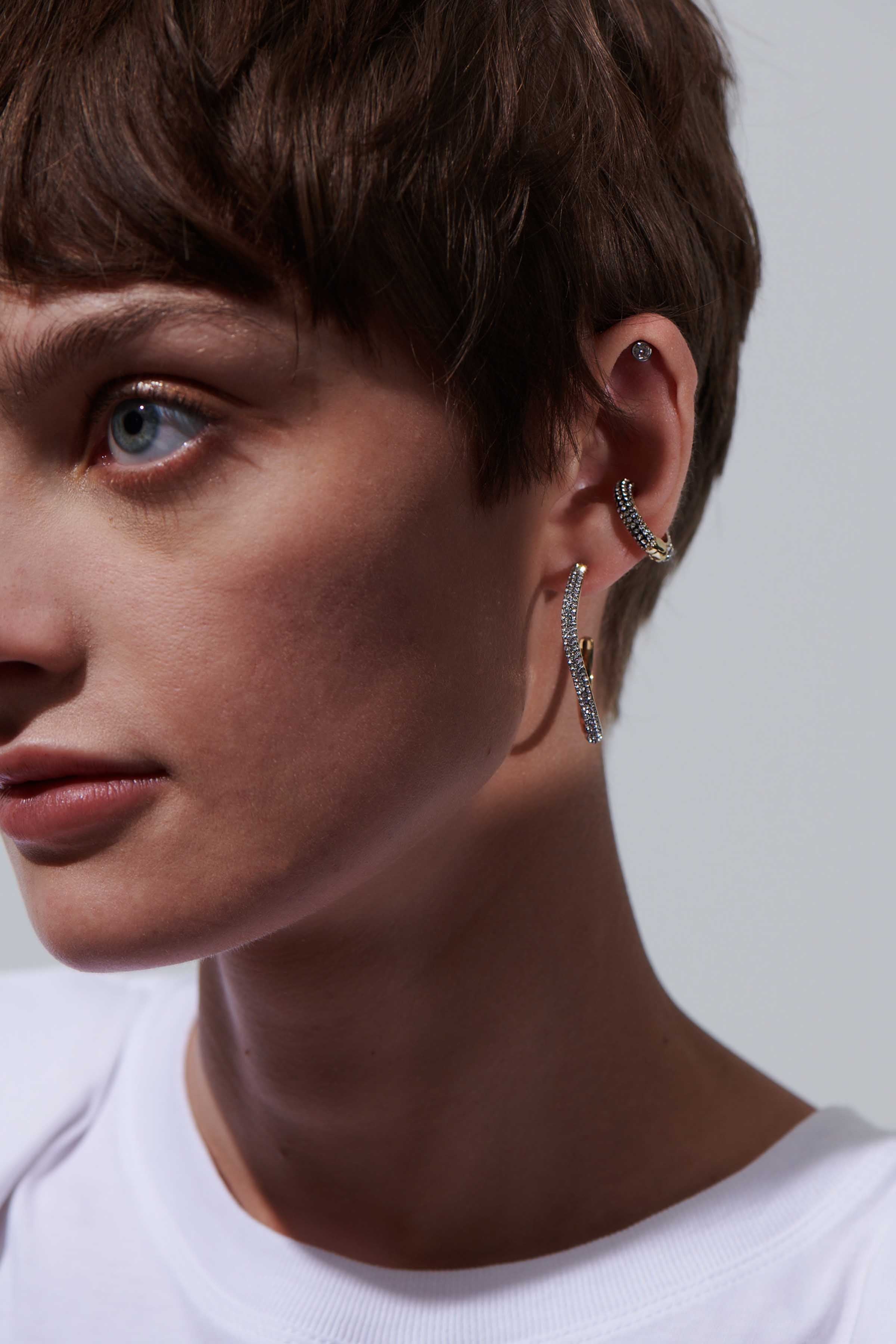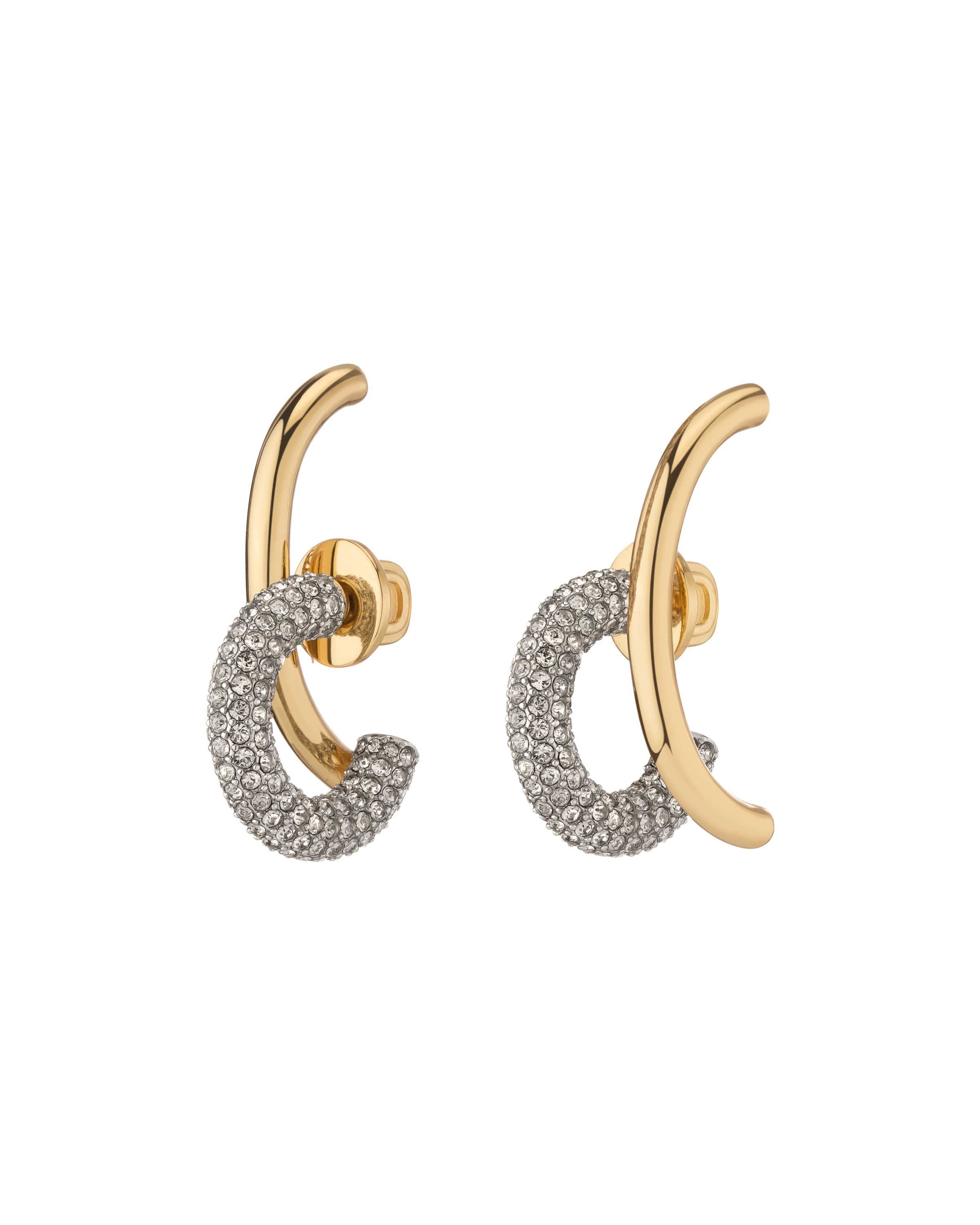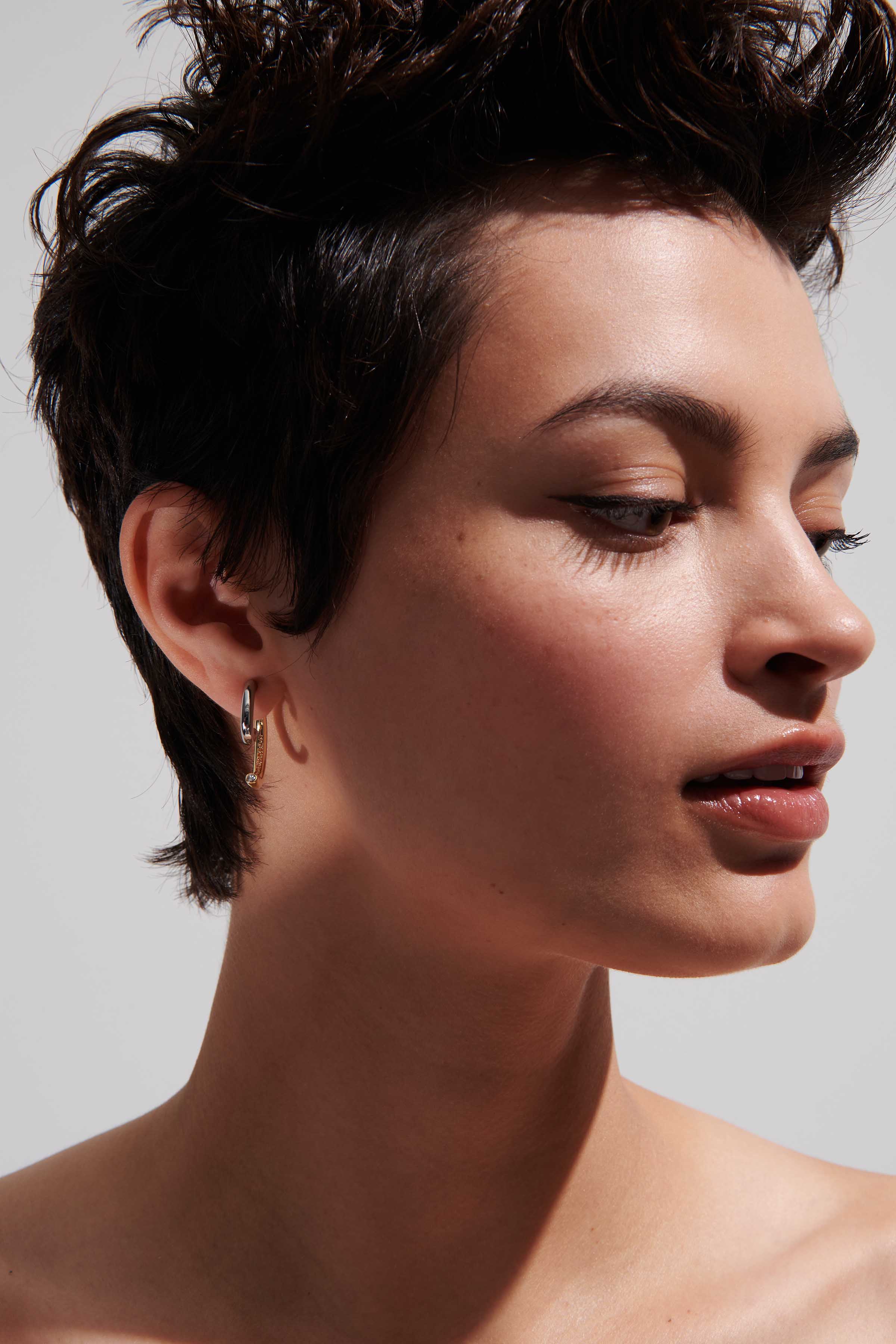 Our best-selling two tone Tina Hoops now with a pave finish. With their angular, unique design for everyday wear, these hoops feature stylish, bisecting shapes adding glam to any look.